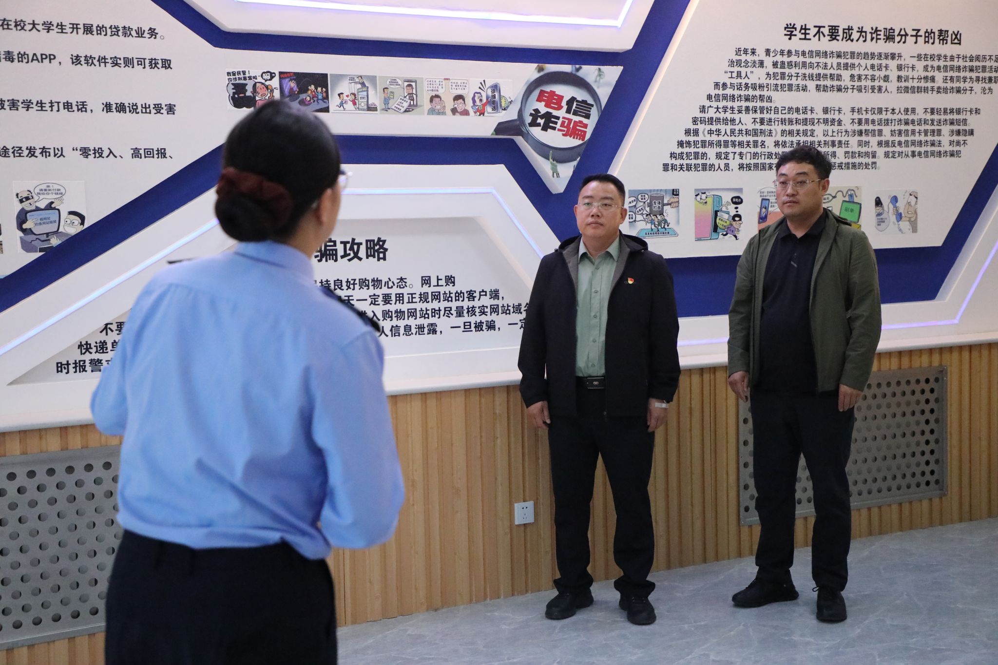 王红利一行参观了学校警务室宣传、服务、调解中心功能板块及配套硬件设施,详细了解了校警联动工作机制,并就警务室运行及安全管理工作开展情况与我处人员进行了交流沟通。