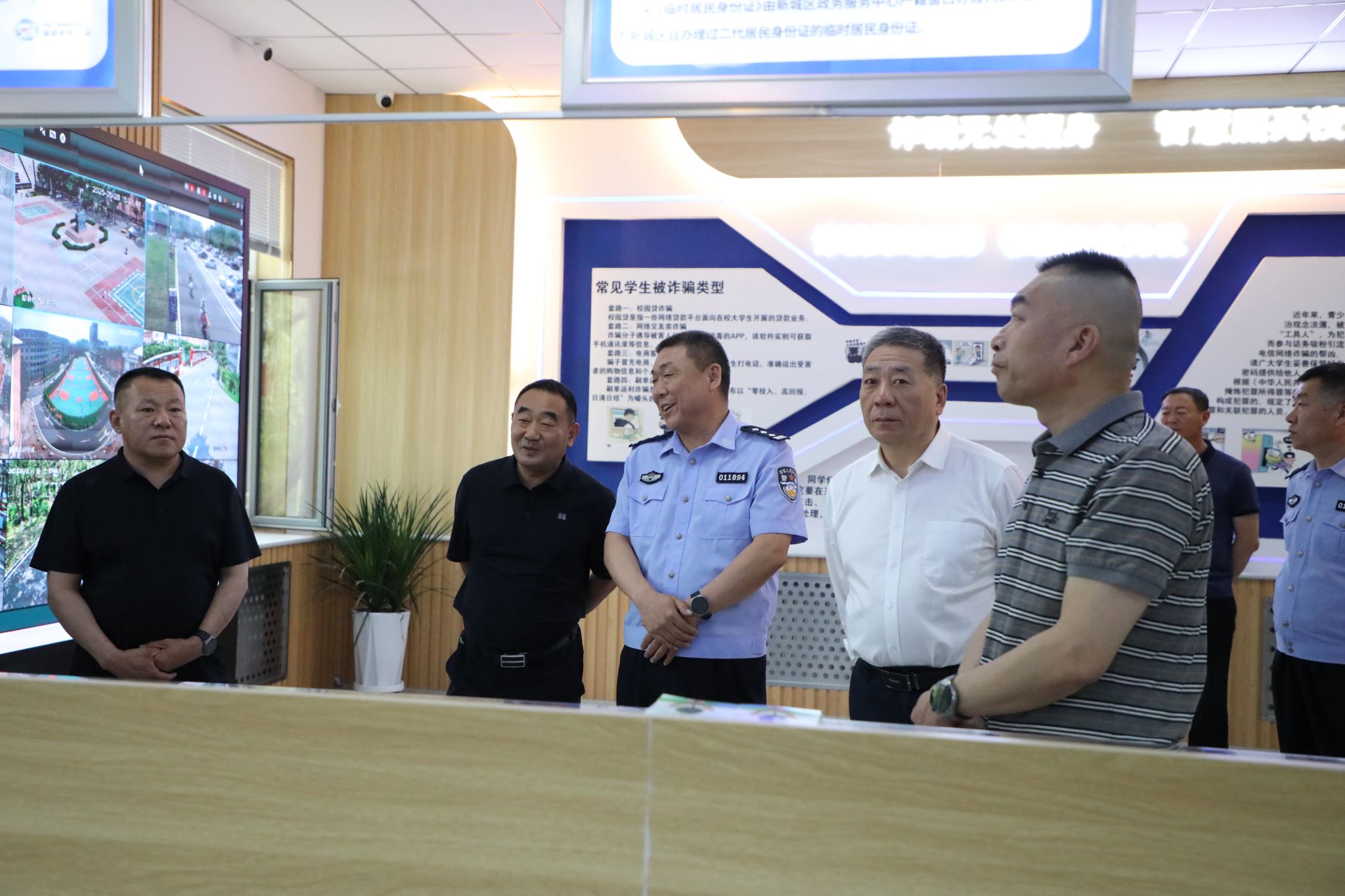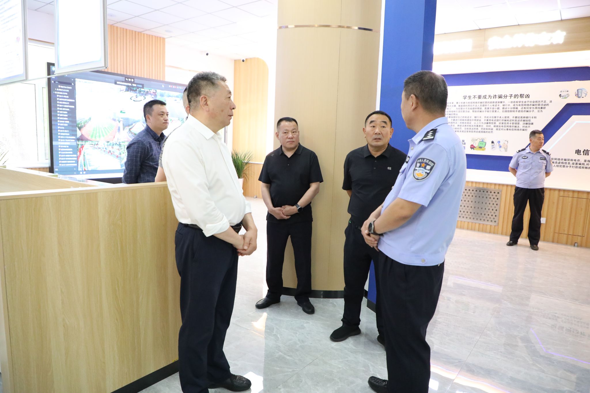 调研组一行参观了学校警务室宣传、服务、调解中心三大职能板块以及“警务室-监控中心”实时智慧联动平台,详细了解了各功能区域配套设施设备及整体运行情况,着重调研了应急处置、校警联防联控、安全教育、服务师生等方面工作的具体情况。随后,调研组与365英国上市公司安全管理处、警务室相关人员就学校标准化警务室建设及校警高效联动工作模式展开深入研讨。交流中,调研组对365英国上市公司校警高效联动的安全管理创新工作模式给予充分肯定。