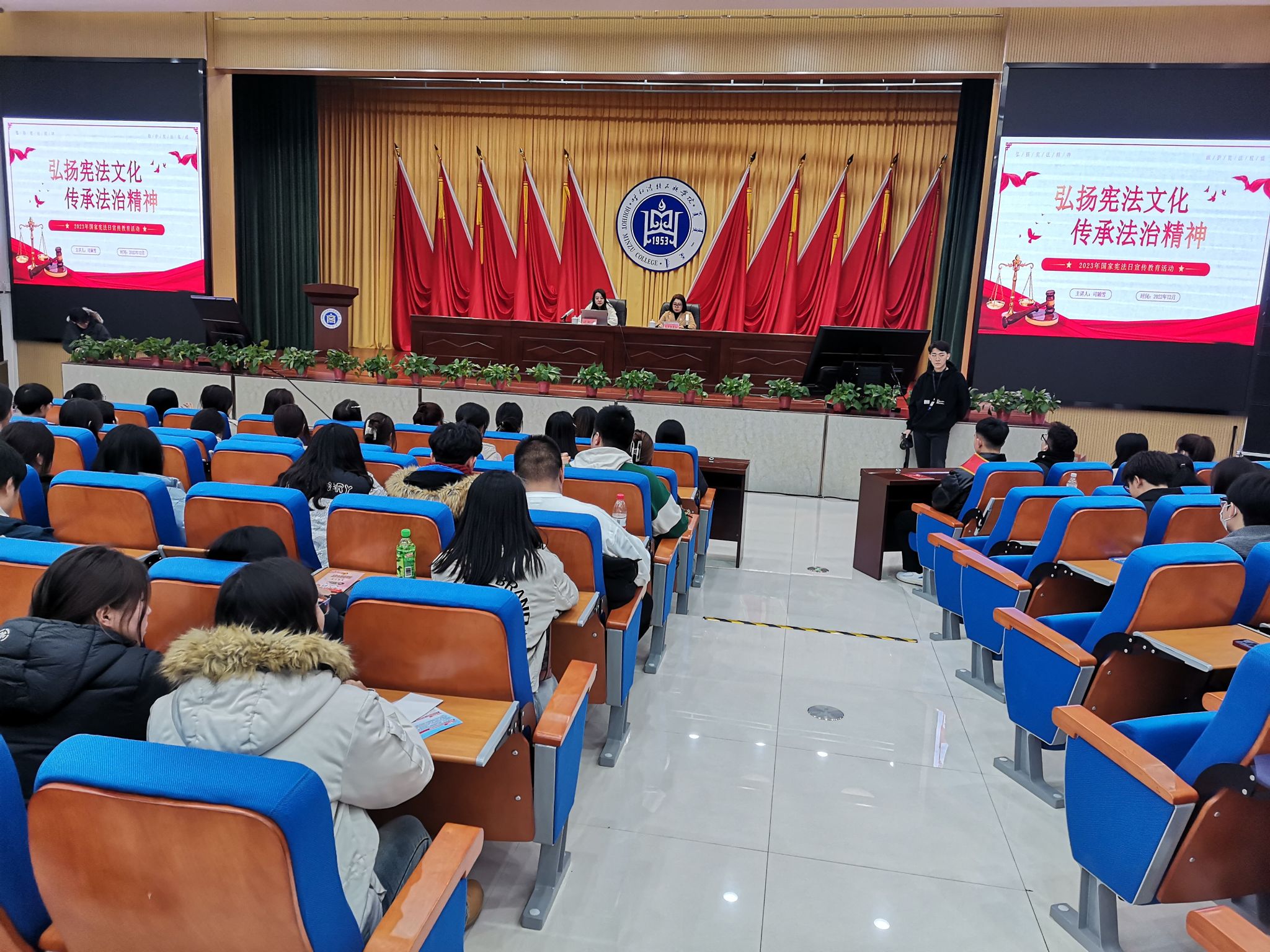学校邀请了呼和浩特市“八五普法”讲师团讲师、内蒙古商贸职业学院司颖雪副教授以《弘扬宪法文化 传承法治精神》为题为师生授课。讲座从节日设立的原因、12月4日的特殊性、设立节日的意义、宪法权威的来源、宪法的实施路径等五个方面为教授了宪法的基本知识和深刻内涵。讲座内容丰富、精彩生动,既有理论指导意义,也有实际指导价值,为学校今后开展宪法知识普及工作提供了宝贵的思路。