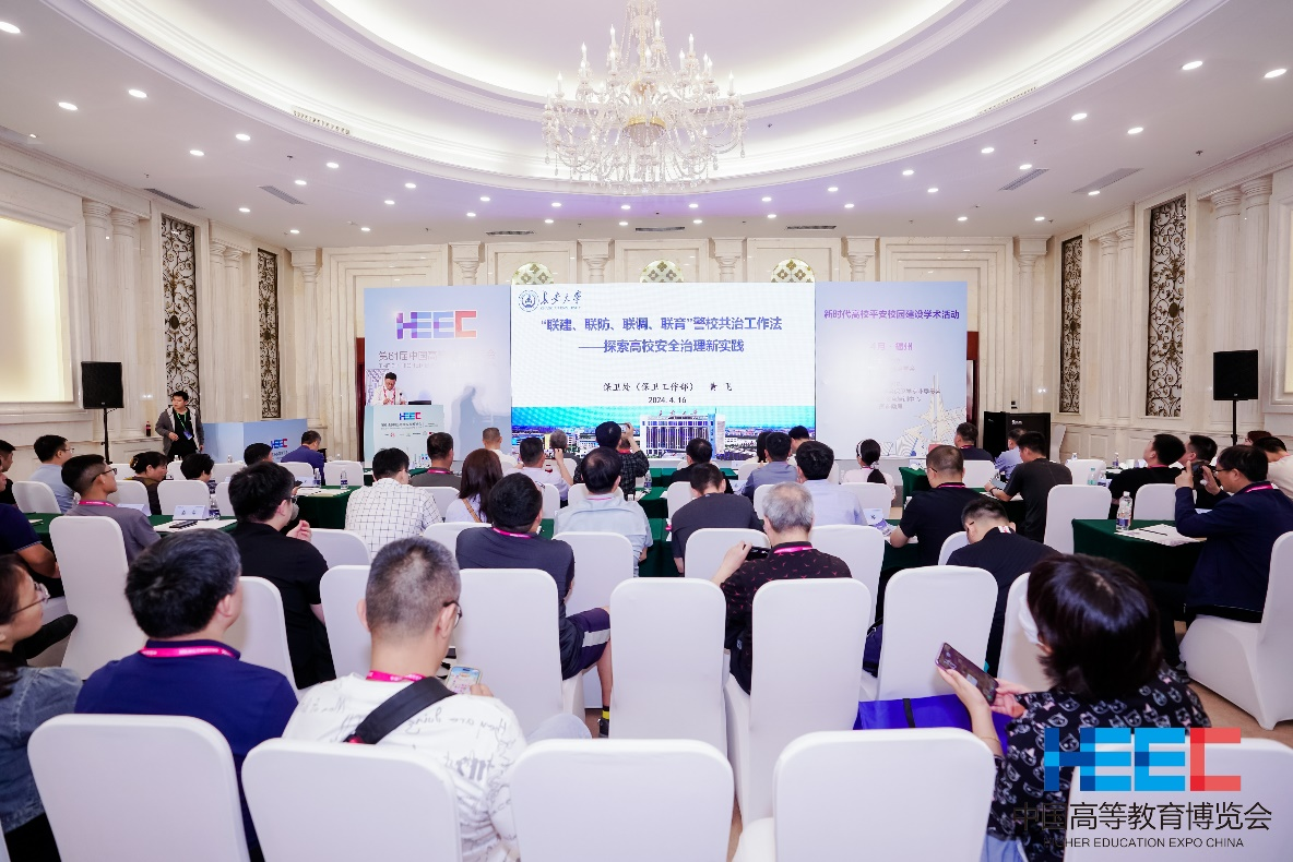 在主题发言环节,邵泽开、黄飞、徐新清、曾亚纯围绕“高水平安全保障高校事业高质量发展”分享了各自高校在落实安全责任制、加强安全隐患排查整治、推进平安校园数字化建设等方面的成功经验,并就如何着力构建校园安全新格局展开深入探讨。