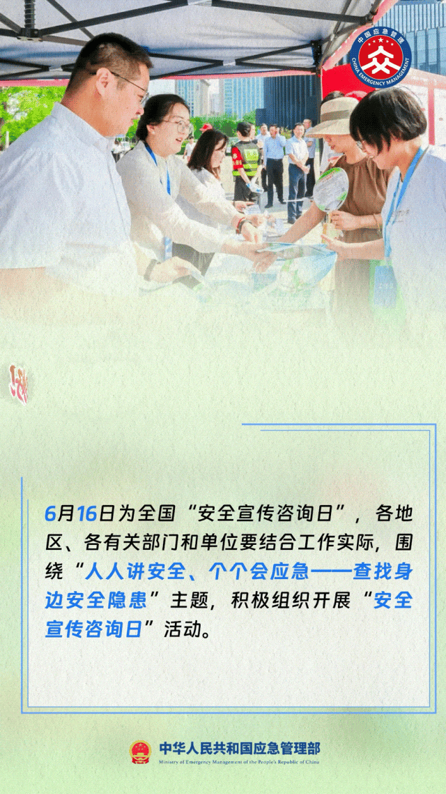 今年6月是第24个全国“安全生产月”主题是“人人讲安全、个个会应急——查找身边安全隐患”。6月16日为全国“安全宣传咨询日”。
