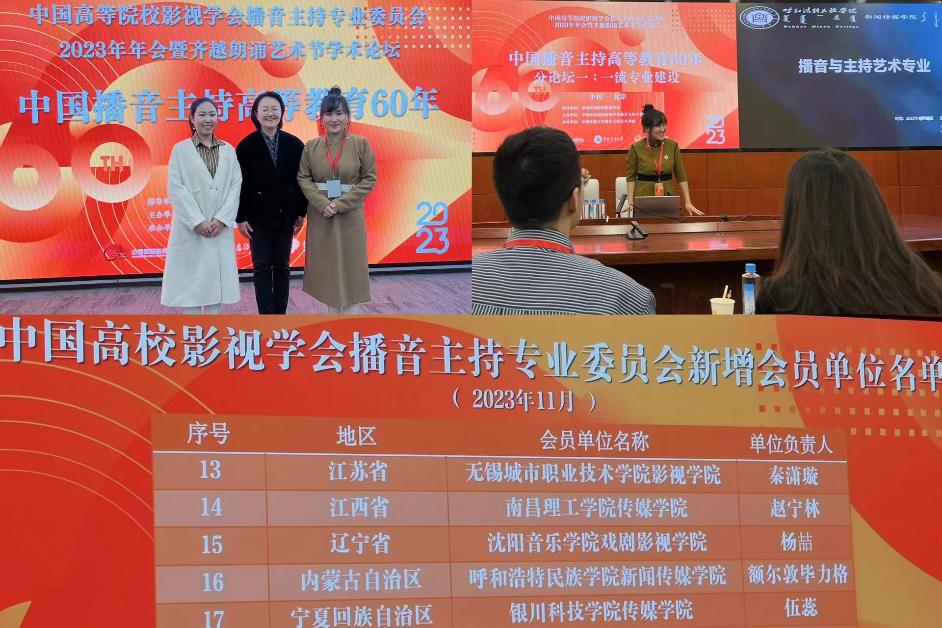 11月18日,我院播音与主持艺术专业乌日更照来、图木舍两位老师前往中国传媒大学参加中国高等院校影视学会播音主持专业委员会2023年年会暨齐越朗诵艺术节学术论坛。在一流专业建设为主题的分论坛上,我院乌日更照来老师做了有关地方性特色播音与主持艺术,即关于蒙古语播音与主持艺术一流专业建设主题发言。同时,我院也入选中国高校影视学会播音主持专业委员会会员单位。