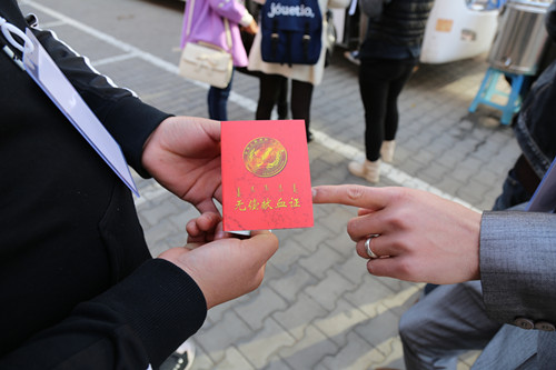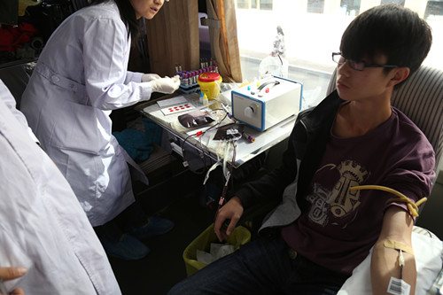 传媒系成功承办爱心献血活动 2015年3月17日,由学院团委主办,传媒系团总支、“鸿雁”青年志愿者协会承办的以“雷锋精神永存 点滴热血助人”为主题的大型爱心献血活动如期举行。共有53名师生成功献血,献血总量为14100ML,为内蒙古血液中心及时补充了库存血量。 大夫为师生免费验血型 一名同学正在献血 获得《无偿献血证》