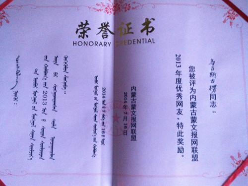 传媒系2011级新闻学专业乌吉斯古楞同学在“内蒙古蒙文报网联盟第二届读者(网友)节”活动中荣获优秀网友奖。