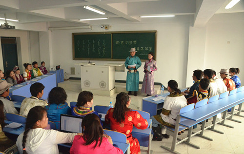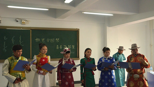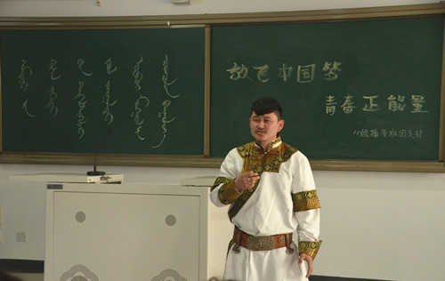 朝气蓬勃的共青团团歌拉开了团日活动的帷幕,阿日海和木其日同学主持活动,所有同学分别用一句话表达了个人的梦想,存布日同学说:“愿与祖国共奋进、与时代齐发展”,毕力格巴特尔同学说:“要勇敢担负起当代青年的历史责任”;海日、那音太和呼日娃等三名同学分别朗诵了个人原创诗歌作品《成吉思汗在看》、《祭拜》和《等待》,娜仁格日乐等六名同学集体朗诵表演了作品《蒙古语广播之声》;阿日海和孙德尔同学分别演唱了歌曲《充满爱的生活》和《内蒙古》。同学们精彩的节目时刻彰显着青春的魅力,散发着积极的正能量。