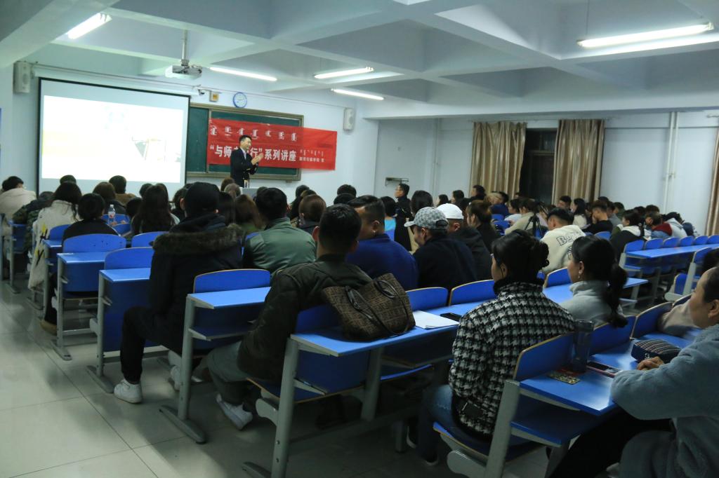 讲座中,赛音乌力吉给同学们分享了自己在大学期间发生的有意义的故事。他强调作为大学生该如何利用好这四年的时光去有效的学习;大学生面对生活中的困难时该如何应对等问题与学生做了深入的交流互动。赛主播以亲身经历告诉学生:“你们或许觉得现在在课堂上所学到的知识点一点用处不大,但是你们真正踏入社会后就会意识到课堂上所学到的内容对你们将来的生活和工作有至关重要的作用。”