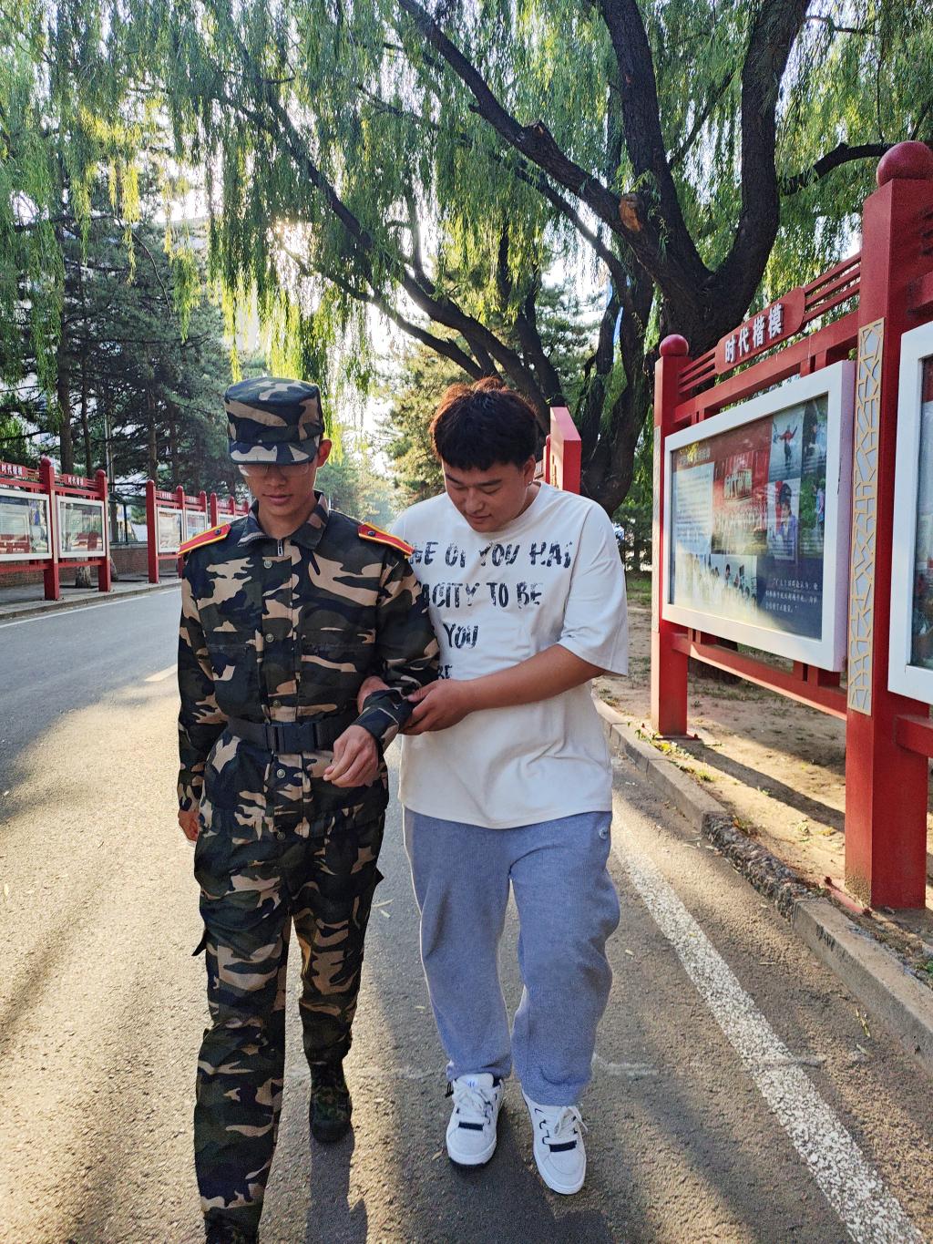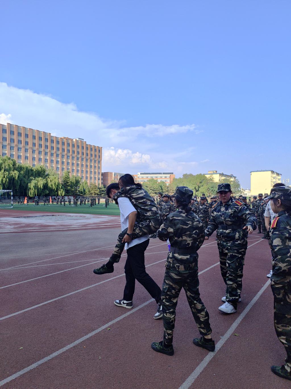 2023年9月15日,新闻传媒学院的一名学生在南苑操场军训期间突然晕倒,在场值班的学生会成员伟乐苏在第一时间迅速背上晕倒的新生,急匆匆地向医务室走去。