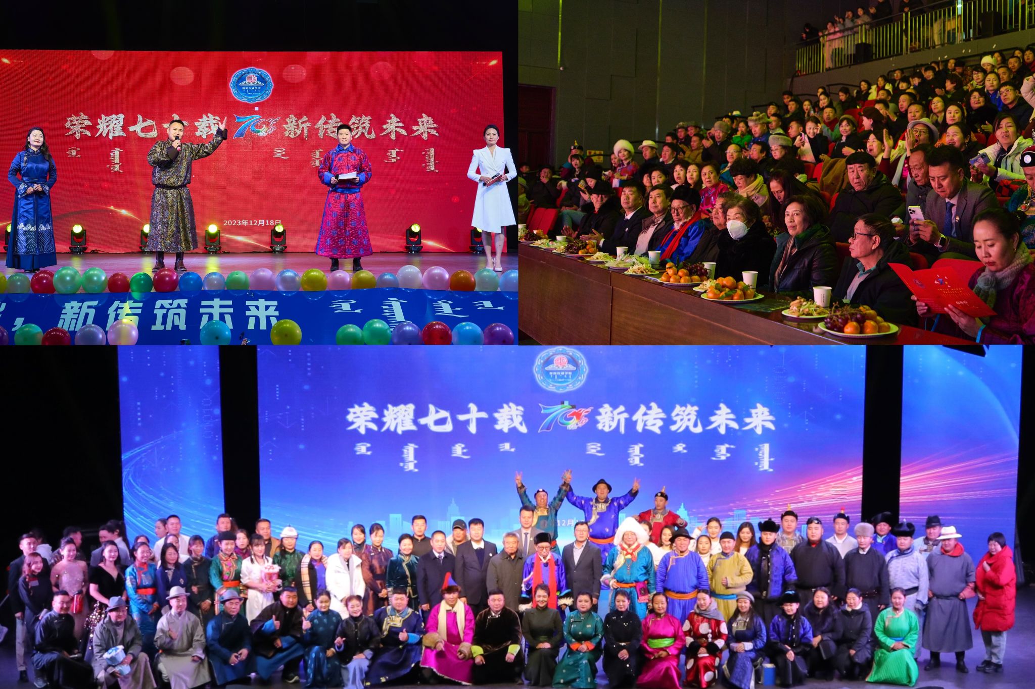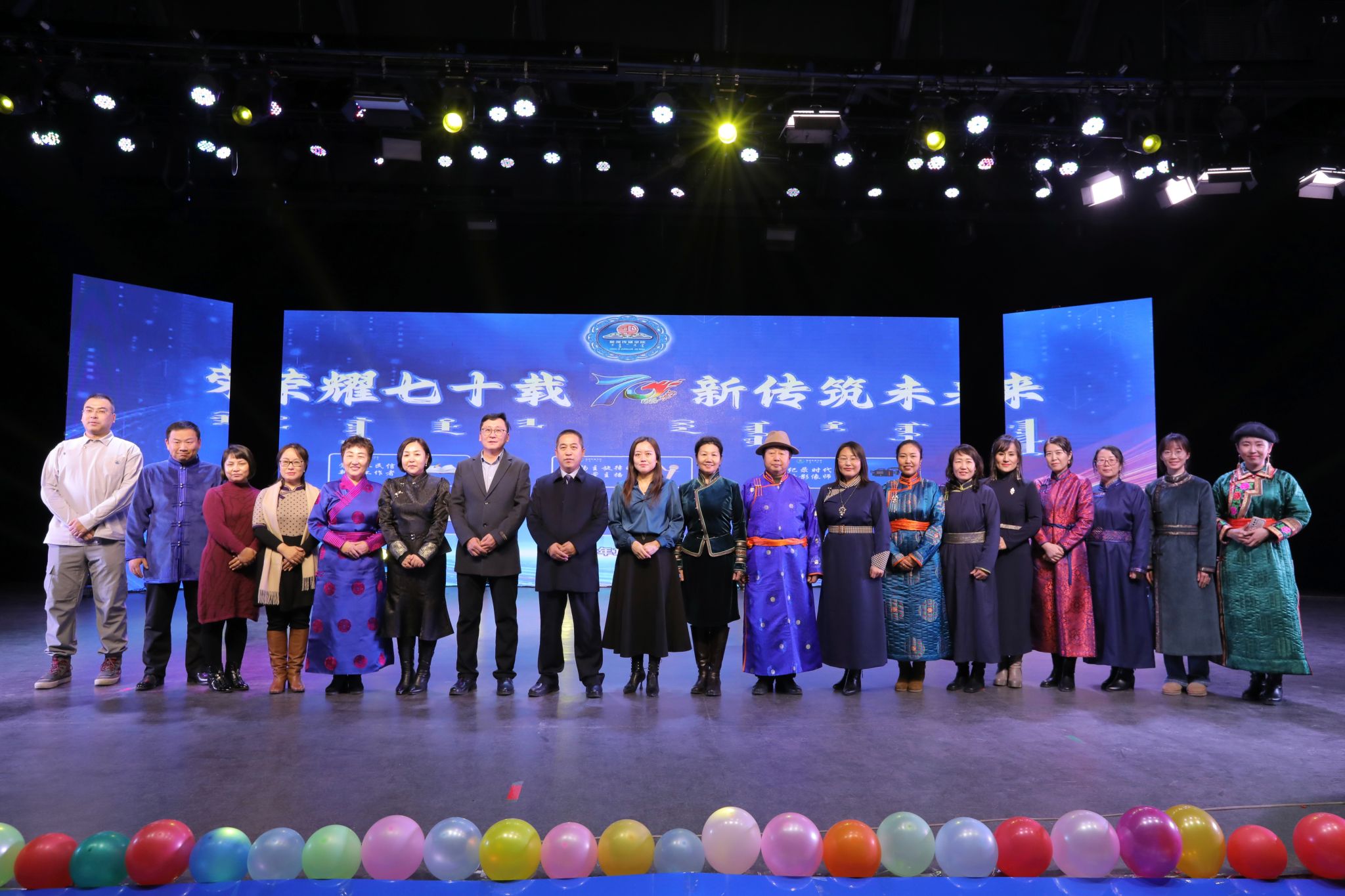 接下来由全院教工上台向到场校友致谢。新闻传媒学院前身是内蒙古蒙文专科学校于1989年创办的新闻系,30多年来为全国各地输送了众多编辑、播音、摄影等专业人才。在学校迎来70周年校庆之际,众多优秀校友重返母校,荣归院系,体现了对母校和学院的莫大支持和深切眷顾。学院全员感谢校友们的到来,希望日后增进院校与校友间的情感交流,携手共进,凝心聚力,共同推动学院各项事业取得更大成就。