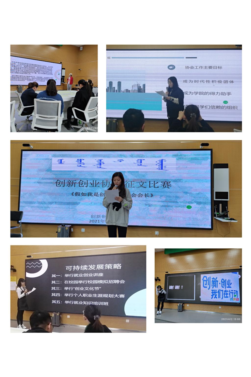 为充分锻炼创新创业协会同学们的创新能力与创新思维,发挥同学们的主观能动性,推动创新创业协会工作,由创新创业学院策划、布置了以《假如我是创新创业协会会长》为题的征文比赛,于2021年3月29日中午和4月2日中午分两场在体育馆五楼正式举行。3月29日首场征文比赛上创新创业学院院长哈斯同力嘎做了开场讲话,为同学们鼓气加油并提出些许殷切期望。两场比赛分别邀请了各5名创新创业骨干教师当评委,有心物教育专任创新创业课程讲师王新域、巴雅尔,创新创业骨干教师陈玉珍、敖日罕、张璟华、白宝华、珠丽等诸位教师,为参赛者进行现场评比打分。经过两场激烈角逐,征文比赛落下帷幕。4月22日,在体育馆五楼举行征文比赛颁奖仪式,评决出一等奖一名、二等奖三名、三等奖五名,并对对获奖学生颁发奖状,以资鼓励。在各位老师与协会成员的共同努力下,此次征文比赛圆满完成。
