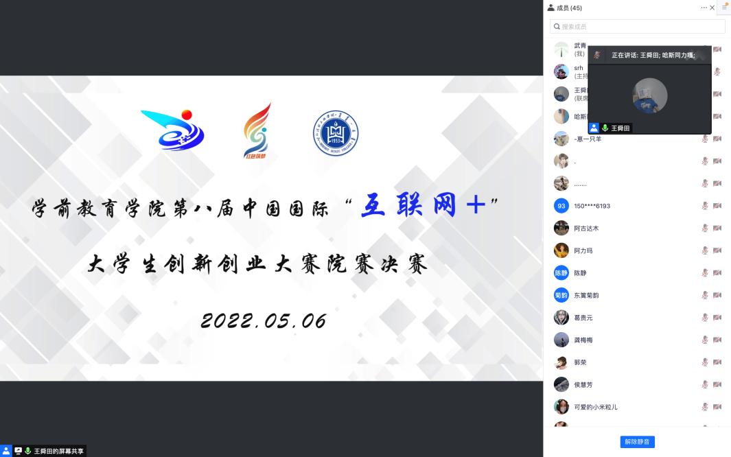 5月6日,学前教育学院通过线上视频形式组织开展了学前教育学院第八届中国国际互联网+大学生创新创业大赛院赛。院赛分为报名、初赛、决赛三个阶段,初赛共有六十四支参赛队伍参加,通过选拔共产生15支队伍晋级院赛决赛。