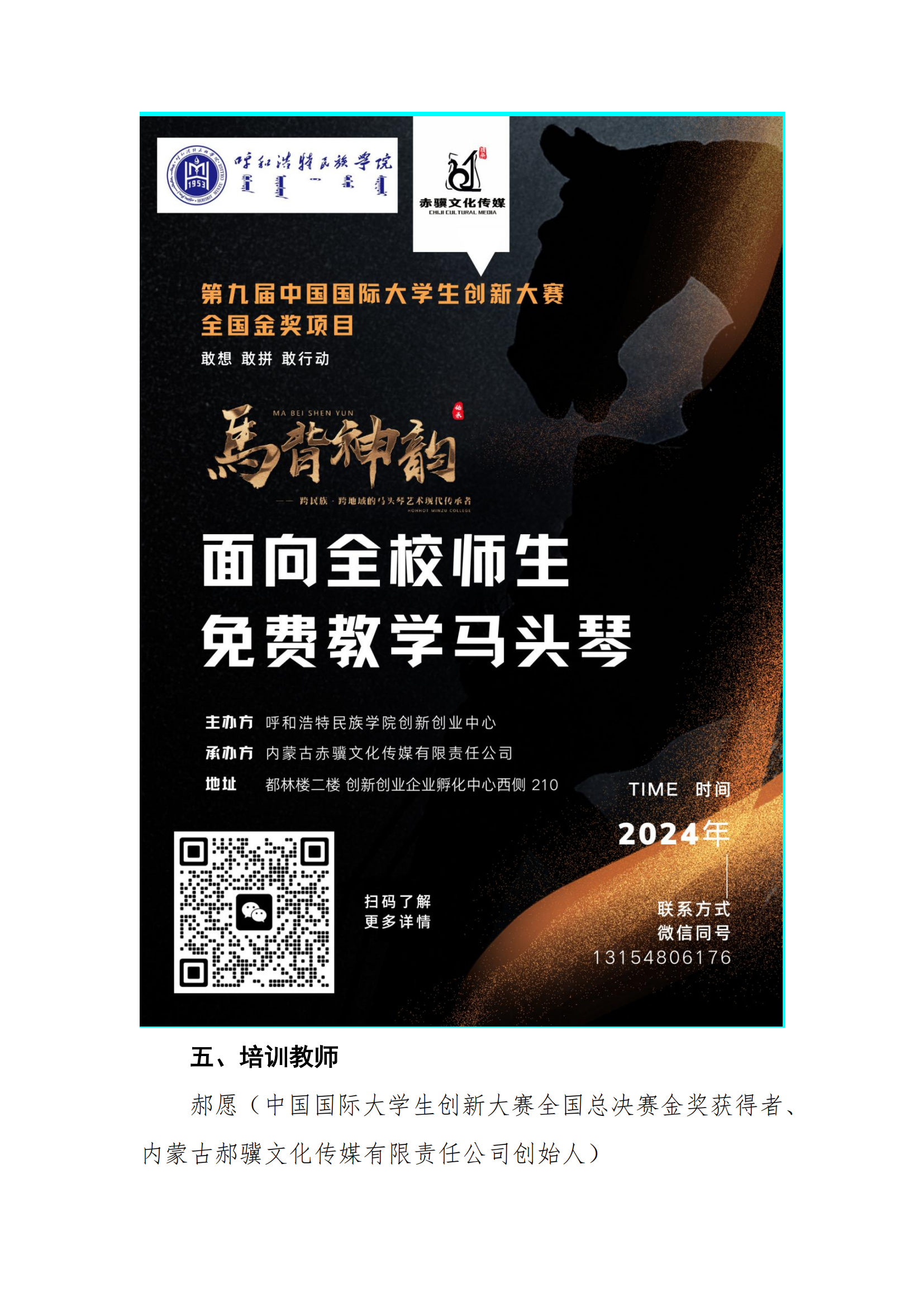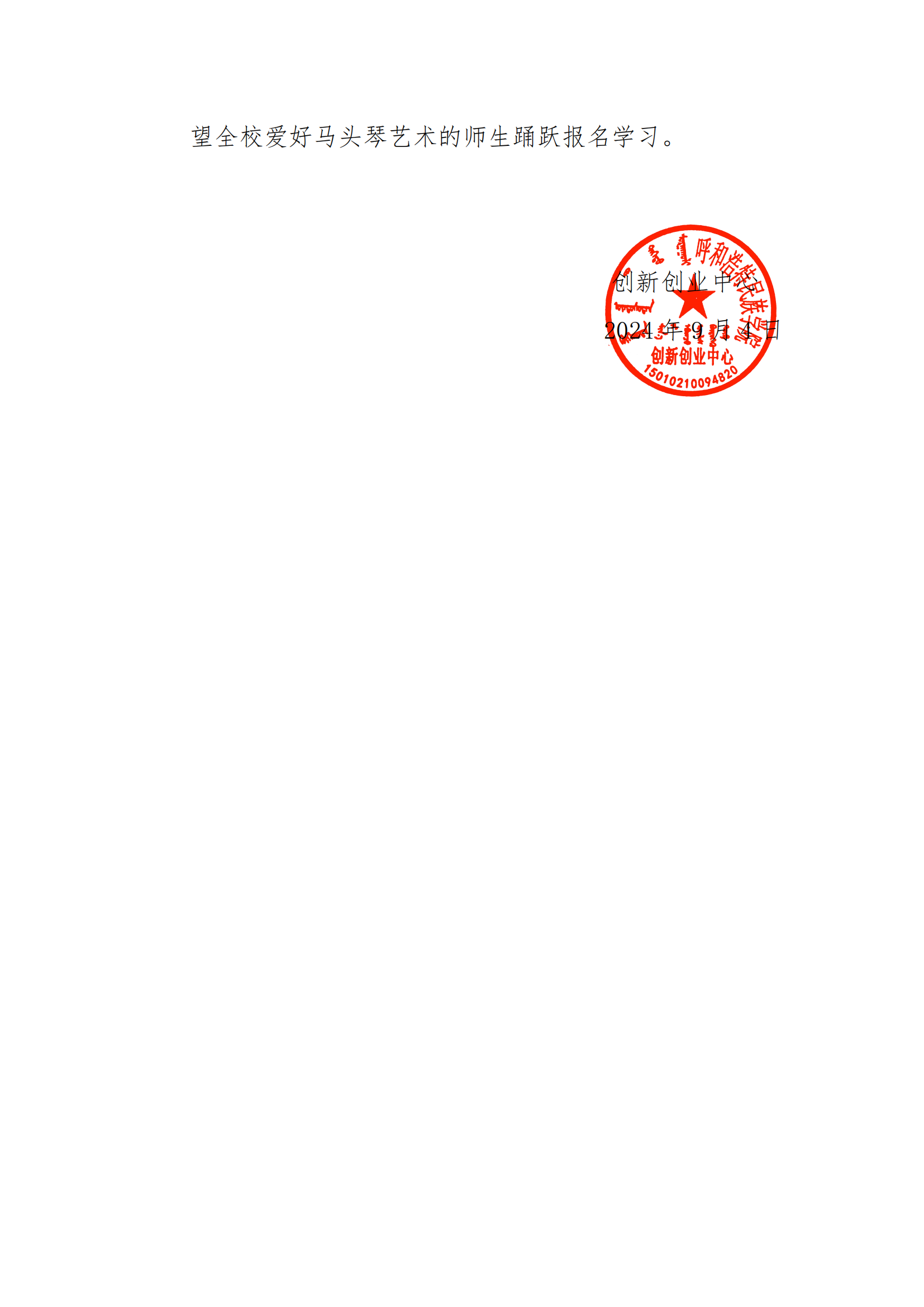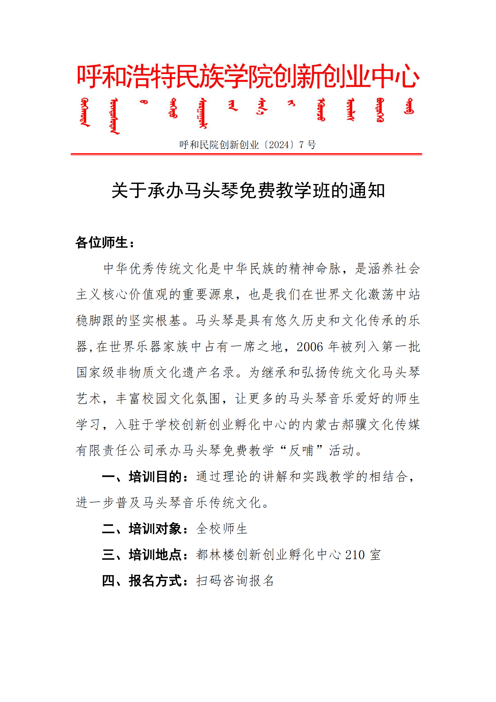 关于承办马头琴免费教学班的通知