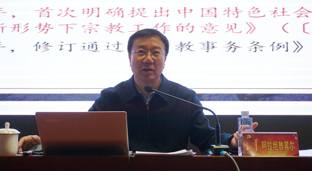 自治区统战部副部长、宗教局局长阿拉坦敖其尔作报告