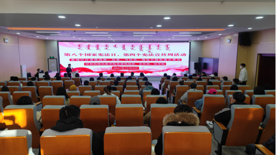 2021年12月4日是第八个国家宪法日,11月29日至12月5日是第四个“宪法先传周”。为深入学习宣传贯彻习近平法治思想,深入学习习近平总书记关于加强和改进民族工作的思想,结合学习贯彻落实中央和自治区党委民族工作会议精神,维护宪法权威,12月2日上午,新城区区委统战部、民族事务委员会、司法局和海拉尔大街街道办事处党工委、海东路司法所一行10余人,由新城区民族事务委员会副主任李锐锋带队,来学校开展普法活动。学校党委委员、统战部部长包君及学校党委统战部、宣传部、法学院、民族学学院、铸牢中华民族共同体意识研究基地相关人员及学生代表100余人参加普法活动。