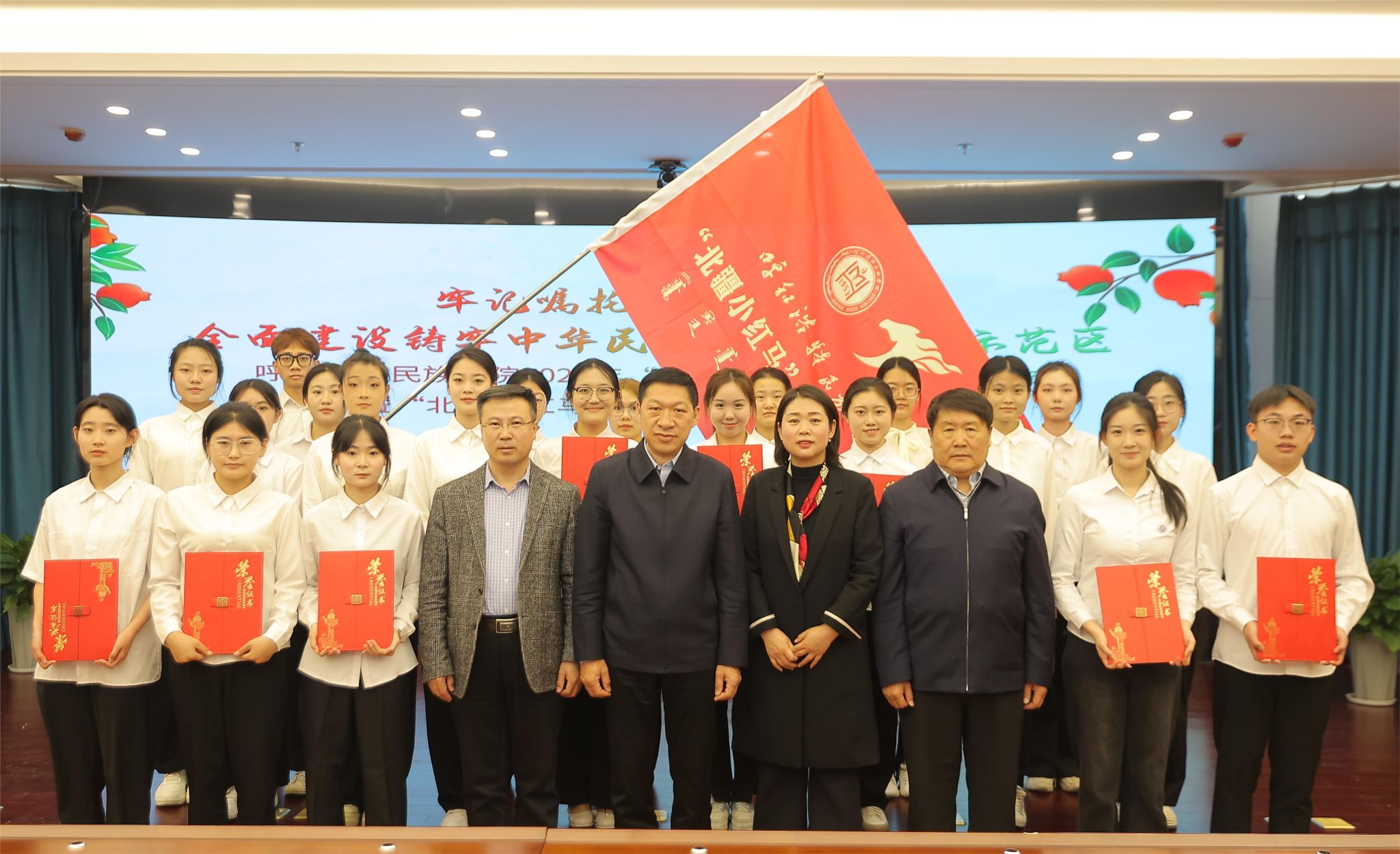 党委书记刘九万向“北疆小红马”大学生讲解团指导教师刘丽颖授旗