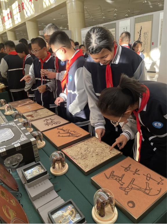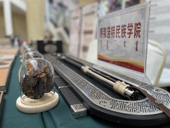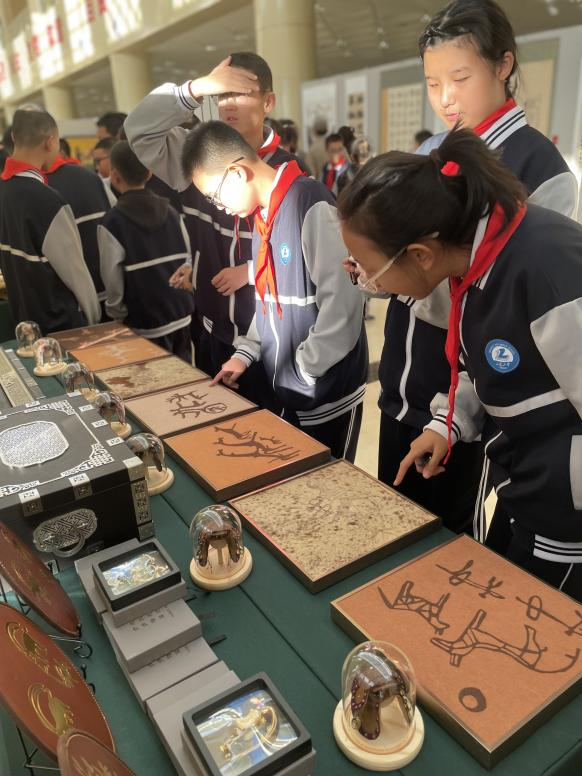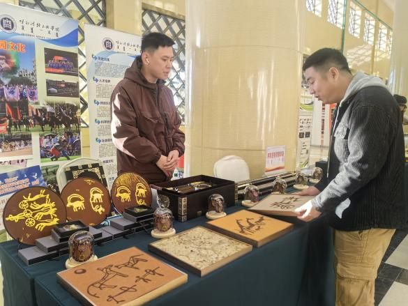 活动期间,学校展出毡画皮画、手工艺品、文创作品等师生创作制作的非遗文化艺术作品,受到现场群众纷纷驻足欣赏。