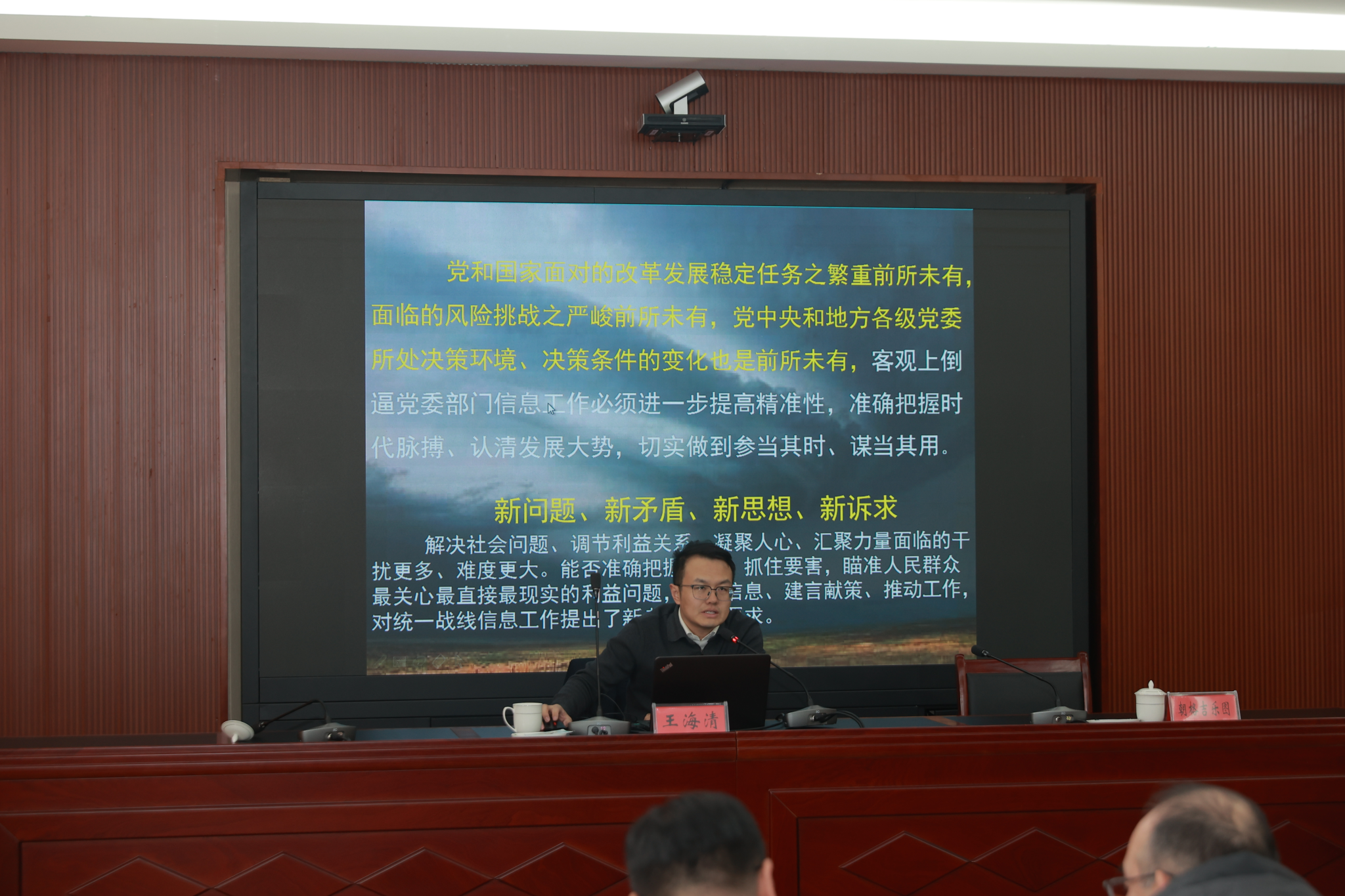 建言献策是统一战线成员发挥人才智力优势参政议政、服务社会的重要途径。为进一步提升学校统一战线成员建言献策的能力和水平,12月20日下午,学校在办公楼4楼会议室召开建言献策实操培训会。统战部全体成员、党外知识分子、留学归国人员代表共40人聆听。培训会由党委委员、统战部部长朝格吉乐图主持。