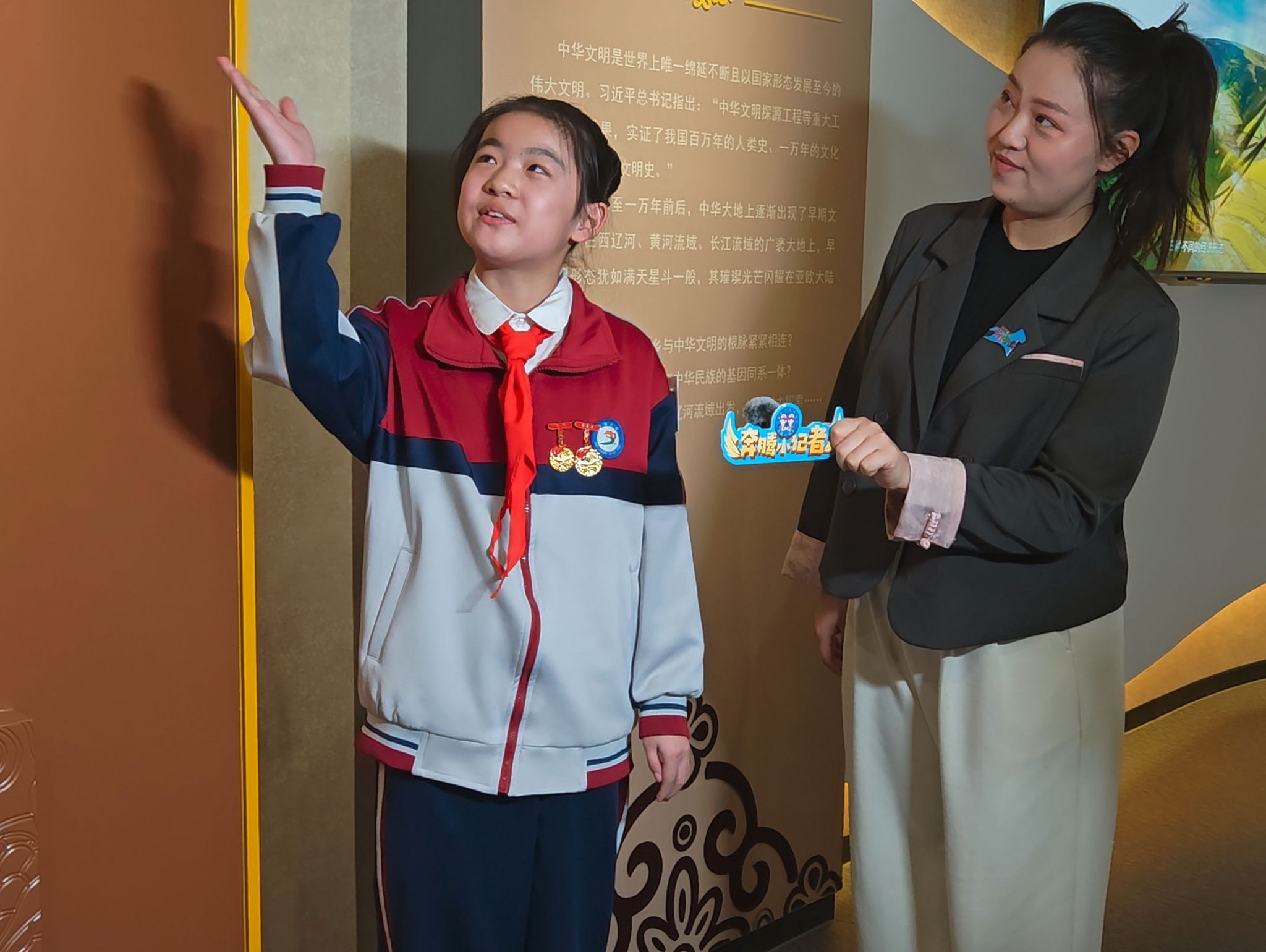 在活动中,“北疆小红马”大学生讲解员陈宣锦,以大手拉小手的方式,带领于思涵、王赟泽、王宸菲、鲁旭瑶、肖清云、郝思语等6位北垣小学(公主府校区)的红领巾讲解员一道开展讲解。讲解员们以中华文明的起源为起点,结合馆内丰富的图文、实物以及多媒体互动等教育资源,引导小记者们探索“我们从哪里来?”“我们是谁?”“我们要到哪里去?”的答案,深入理解中华民族共同体的含义。参观结束后,美术与设计学院的大学生与小记者团成员共同创作了以“石榴籽 心连心”为主题的画卷。本次活动通过“听、看、绘”相结合的方式,使青少年在行走的课堂中埋下爱我中华的种子,树立正确的国家观、历史观、民族观、文化观、宗教观,巩固民族团结的思想根基。