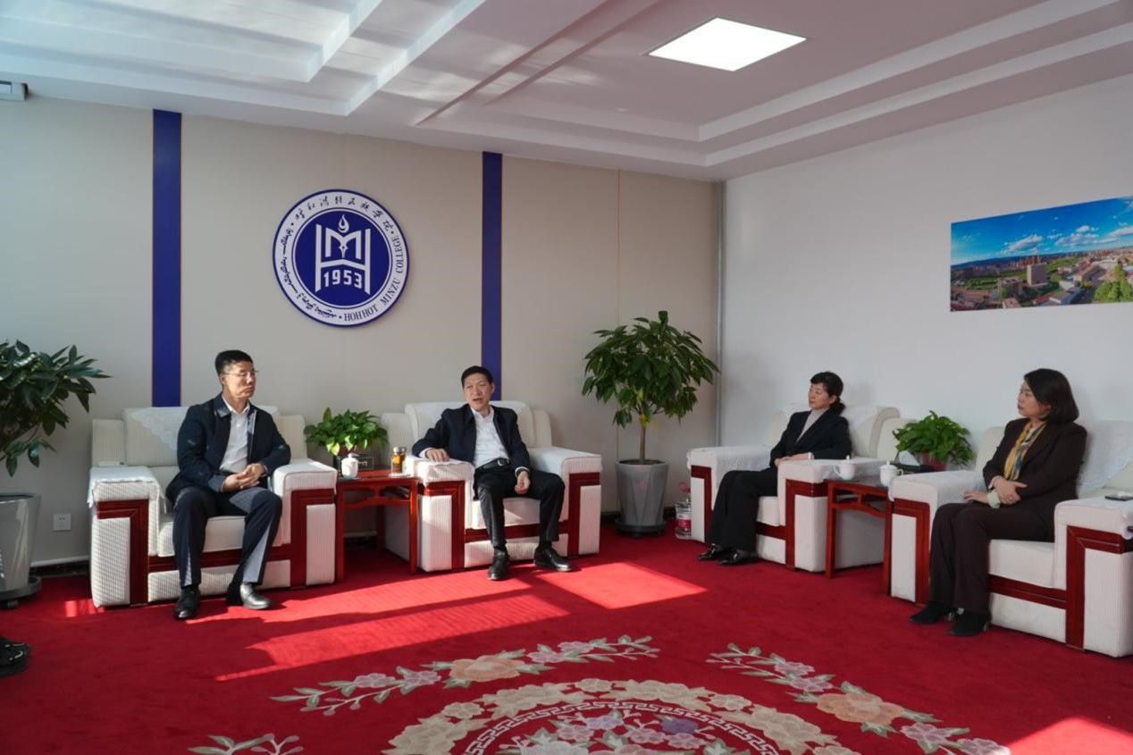 格根哈斯对李伟威一行的到来表示热烈欢迎,并简要介绍了学校历史沿革、发展历程、学科专业、师资队伍等情况。李伟威介绍了赤峰学院在铸牢中华民族共同体意识工作、学科建设、专业发展、人才培养、服务地方等方面的基本情况。双方就铸牢中华民族共同体意识研究基地的运行机制、教育馆的运维经验、校园文化建设、教育教学、学科建设、构建“大思政”格局等工作的经验和做法作了深入交流。双方表示,要进一步围绕贯彻主线加强交流合作,推动双方教育事业高质量发展,为办好自治区两件大事作出应有贡献。