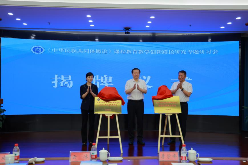 开幕式上,李学锋、云冰、王敏共同为大中小学中华民族共同体意识教育一体化虚拟教研室、《中华民族共同体概论》课程实践教学基地揭牌。