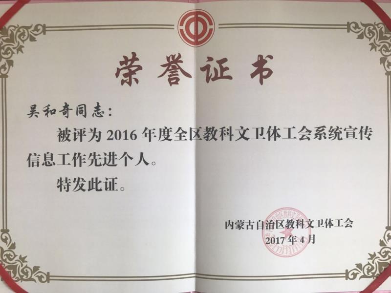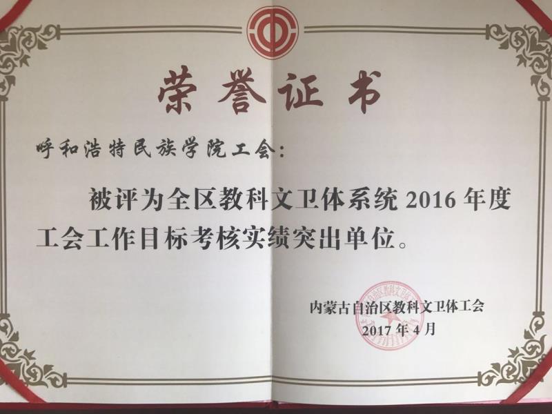 在自治区教科文卫体工会年度考核中,365英国上市公司工会被评为 “2016年度目标考核实绩突出单位”,工会副主席吴和奇同志和闫晋亮同志获自治区教科文卫体工会“2016年度宣传信息工作先进个人”荣誉称号。