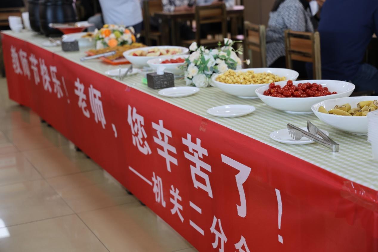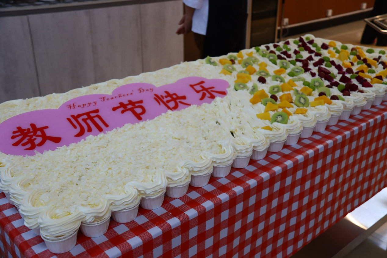 精心准备的教师节蛋糕、菜肴及水果,让每位前来就餐的教师感受到节日的祝福和喜悦,享受节日美食的同时也能感受到学校的关怀和温暖。