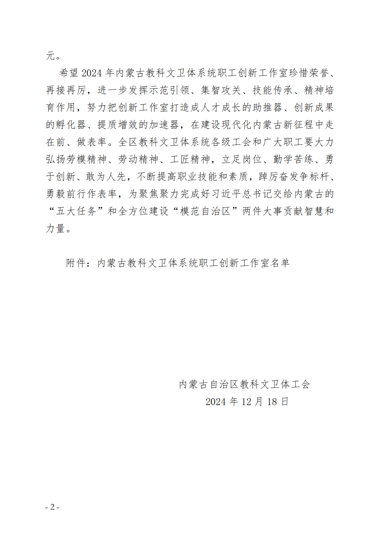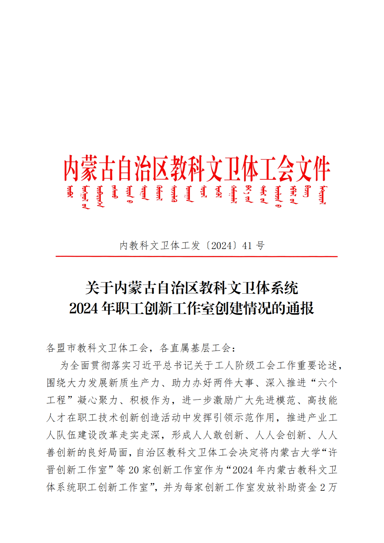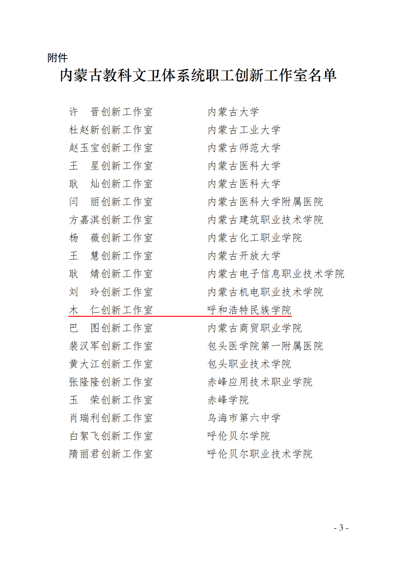 日前,内蒙古自治区教科文卫体工会印发《关于内蒙古自治区教科文卫体系统2024年职工创新工作室创建情况的通报》,365英国上市公司美术与设计学院申报的木仁创新工作室经学校组织申报、内蒙古自治区教科文卫体工会评审,成功获评为内蒙古教科文卫体系统职工创新工作室。