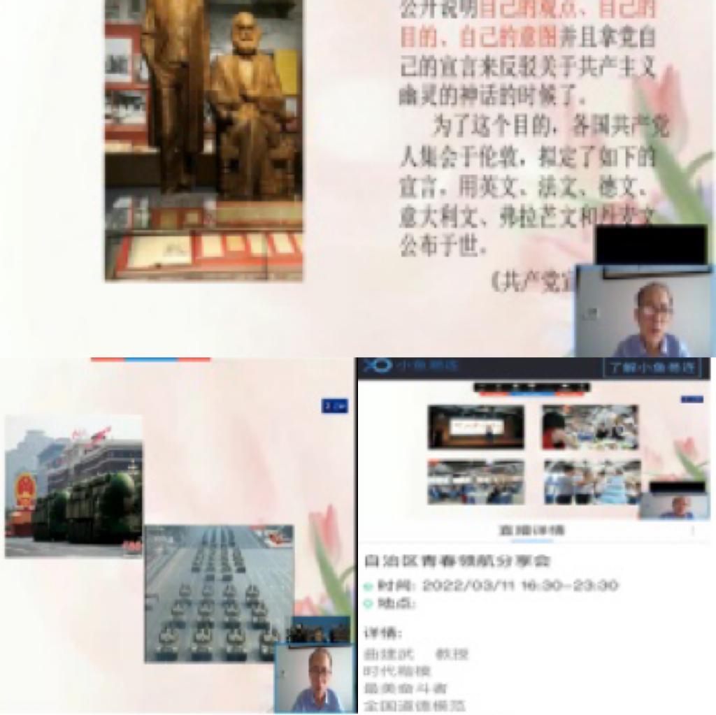 2022年3月11日,公共管理学院党总支组织全体党员和班主任、辅导员老师观看了由内蒙古自治区党委宣传部、自治区教育厅、共青团内蒙古自治区委员会依托高校思政名师工作室搭建的“青春领航”分享会推出的“时代楷模”荣誉称号获得者——大连海事大学曲建武教授就如何帮助学生系好人生的“扣子”视频讲座。