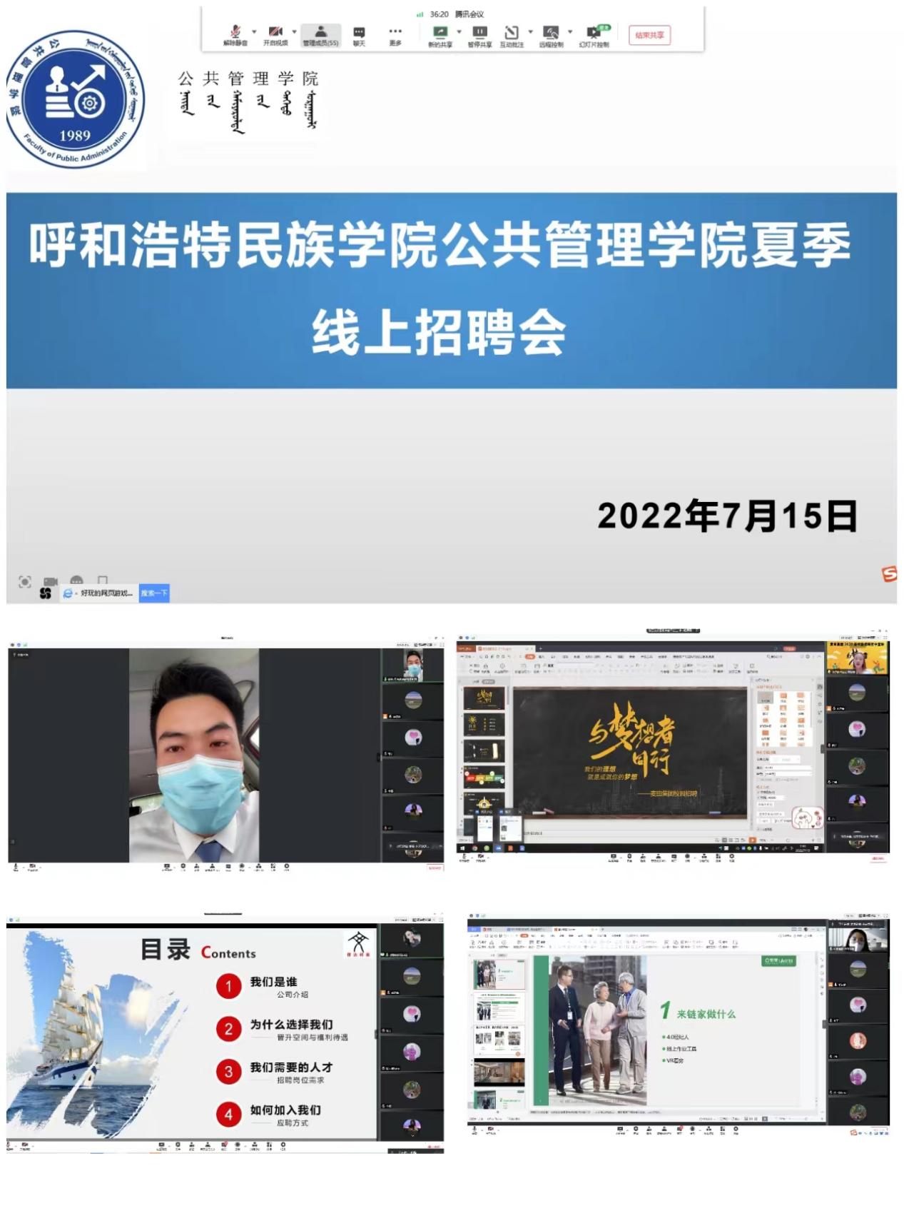 为切实做好我院2022届毕业生就业工作,提前谋划2023届毕业生实习和就业工作,7月15日,学院召开2022届毕业生线上招聘,新丝路文旅企业管理有限公司、内蒙古信达档案技术服务有限公司、北京麦田房产经纪有限公司、北京链家置地房地产经纪有限公司、贝壳找房呼和浩特区域合作公司等5家企业应邀参加,提供就业岗位100余个。会议由学院就业工作联络员前达蒙主持,学院党总支书记海霞、党总支副书记额尔敦格日乐,2022届毕业班主任哈斯同力嘎、呼斯勒图出席,2022届、2023届毕业生共百余人参加。