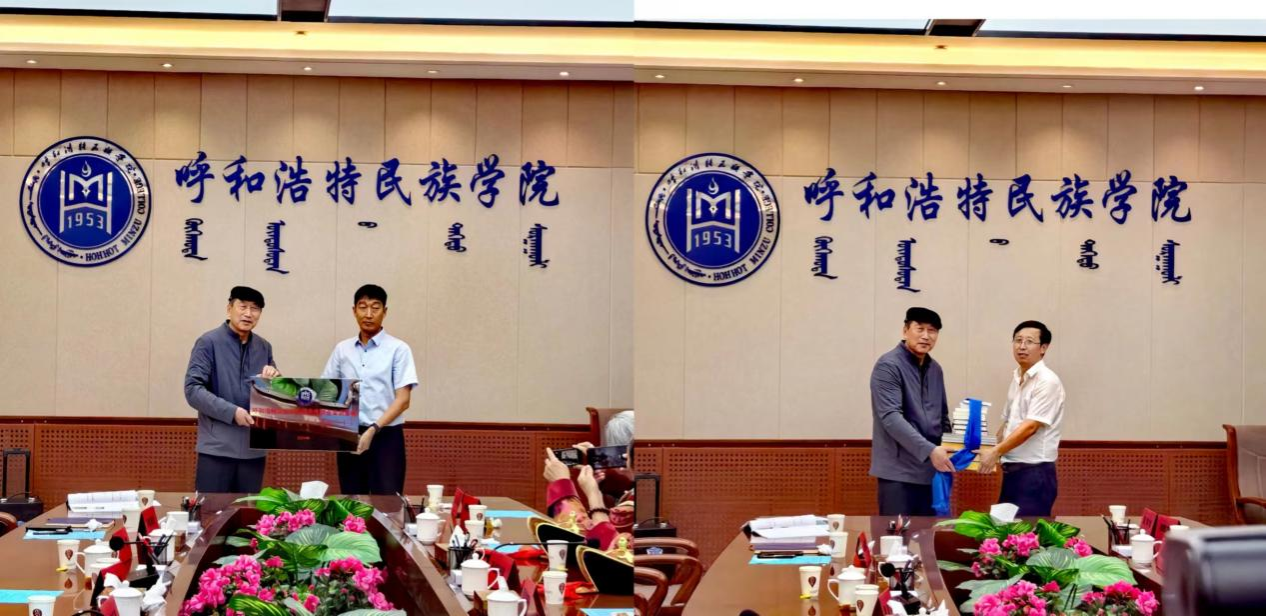会议最后,公共管理学院与巴林右旗非物质文化遗产保护协会进行了实践基地的揭牌仪式和巴林右旗非物质文化遗产保护协会对公共管理学院的赠书仪式,双方并表示此次座谈会达到了互相分享、相互学习的效果,以后会加强在非遗文化传承与保护方面的合作与交流,共同推动非遗文化的发展与繁荣。