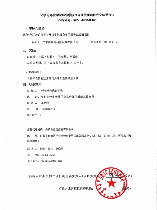 化学与环境学院特色学院及专业提质项目成交结果公告
