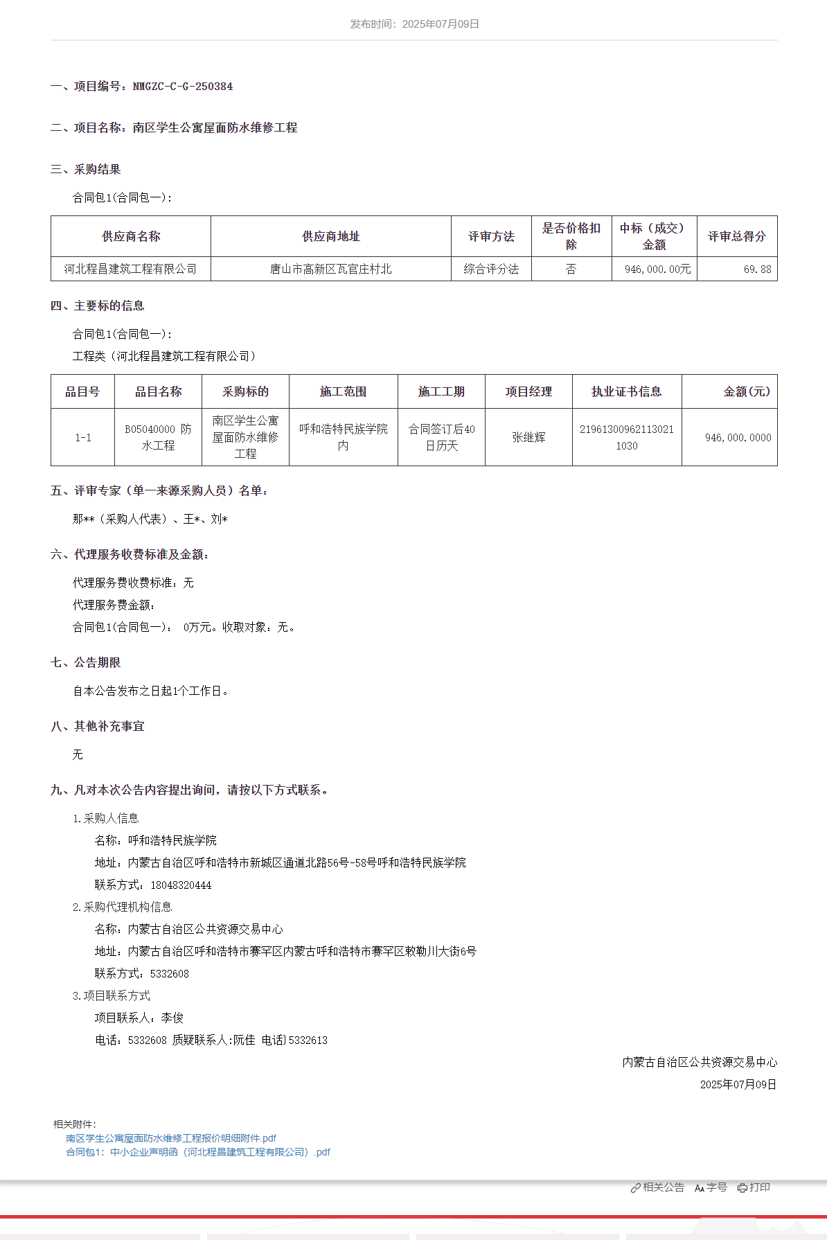 365英国上市公司南区学生公寓屋面防水维修工程中标(成交)结果公告