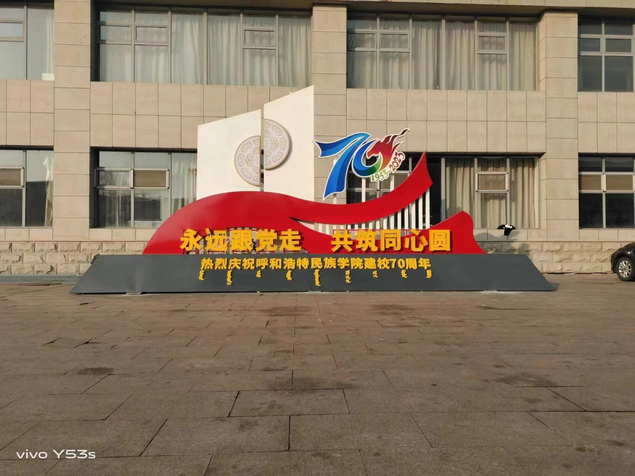 环境建设工作组根据校区安排,分别在东西门广场、都林楼广场、尚智楼广场、学术报告厅草坪、综合楼广场、美术楼西侧停车场、办公楼南侧草坪等地,安装了9个校庆标志物打卡点和4个蒙古包,更新更换东西门校徽和部分楼宇门头文字,购置摆放绿植和花篮,将校区装点一新,喜迎校庆,烘托校庆氛围。