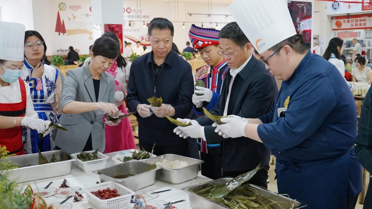 端午节是中国首个入选联合国教科文组织《人类非物质文化遗产代表作名录》的传统节日。为深入学习贯彻习近平总书记关于弘扬中华优秀传统文化的重要指示精神,在民族政策宣传月深入开展之际,5月30日中午,学校党委统战部、学生工作部、后勤管理处邀请呼市文化艺术研究院(非遗中心),联合开展“非遗润北疆·浓情过端午”主题活动。校领导刘九万、王敏、格根哈斯、王冬梅、高喜天、刘瑞鸿、额尔敦布和、双虎出席,相关部门负责人、师生代表共50余人参加活动。