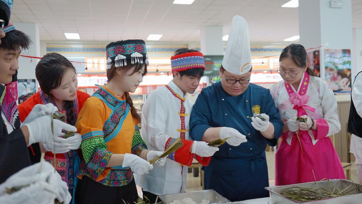 活动现场,非遗传承人、新东方烹饪集团高级主讲教师崔伟现场向师生传授制作技艺。崔伟从选料、浸米、煮叶、折粽叶、填糯米、放馅料、扎粽绳、煮粽子等方面讲授制作工序。校领导与汉族、蒙古族、锡伯族、瑶族、布依族等20个民族师生围在一起同包粽子,互帮互学,学习端午节文化,感受中华民族优秀传统文化的魅力,现场气氛温馨。