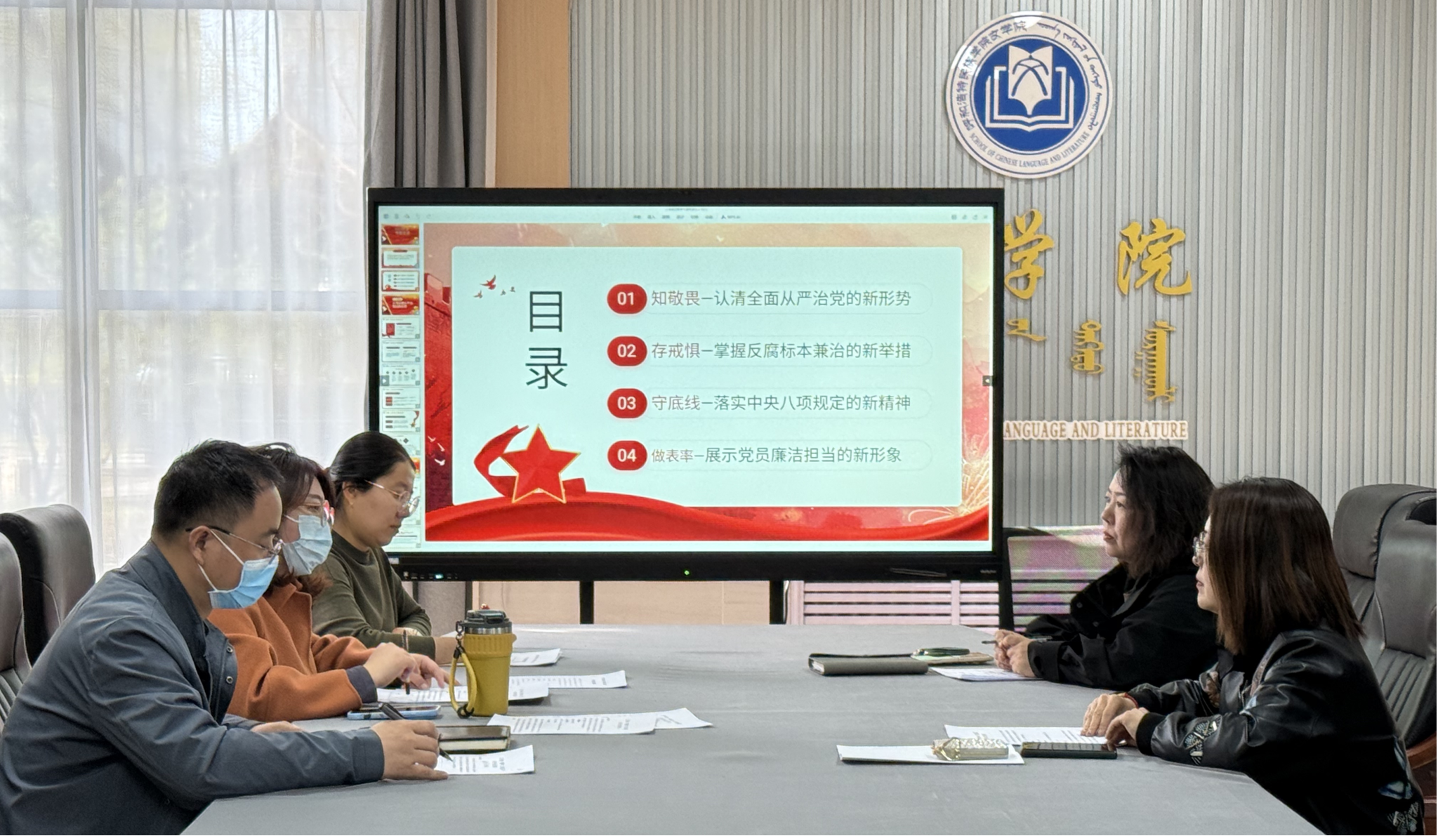 为深入贯彻落实中央八项规定精神学习教育,强化作风建设,2025年4月24日下午,文学院党总支副书记包冬梅讲授专题党课。文学院党总支委员参加党课学习。