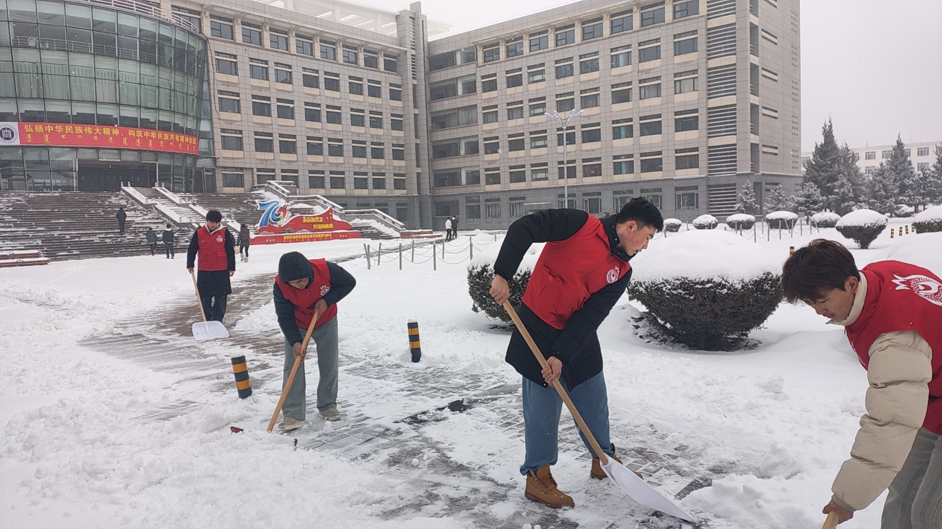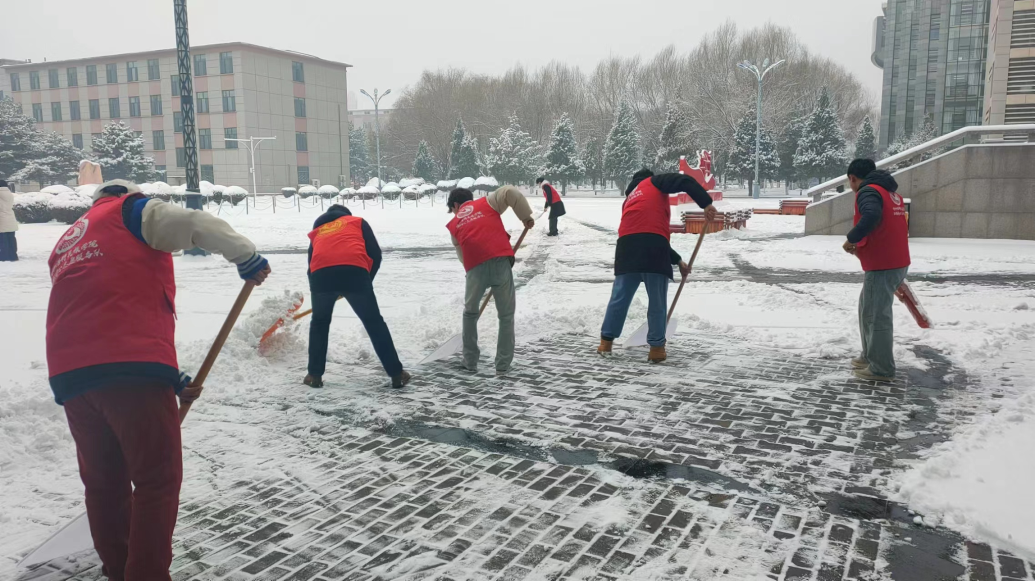 落白寒人,除雪暖心。在老师的带领下,志愿者们手持扫帚与雪铲等工具,全身心投入到扫雪除冰工作中。他们克服寒风、低温,高效配合,团结一致,以极大的热情与动力将厚厚的积雪清理到道路两侧,成功扫除了尚志楼门前级周围的积雪,为大家清理出宽敞干净的通行之路。