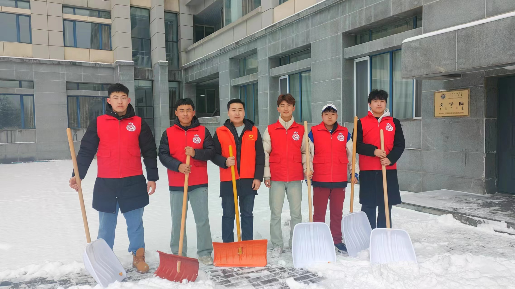 为进一步弘扬“奉献、友爱、互助、进步”的志愿精神,在开学第一天,为维持道路通畅,保障校园师生正常通行,培养学生热爱劳动、乐于奉献的精神风貌,2月27日上午,文学院组织师生志愿者在尚智楼周围主要道路开展校园除雪活动。