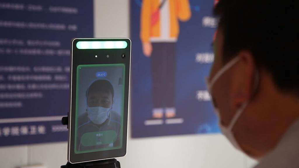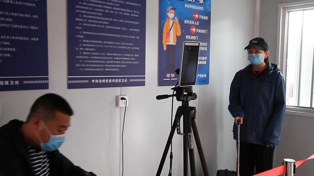 最后,在教学楼的演练场景中,“学生”经红外线测温仪,排队进入指定教室,按照座位标识就坐。