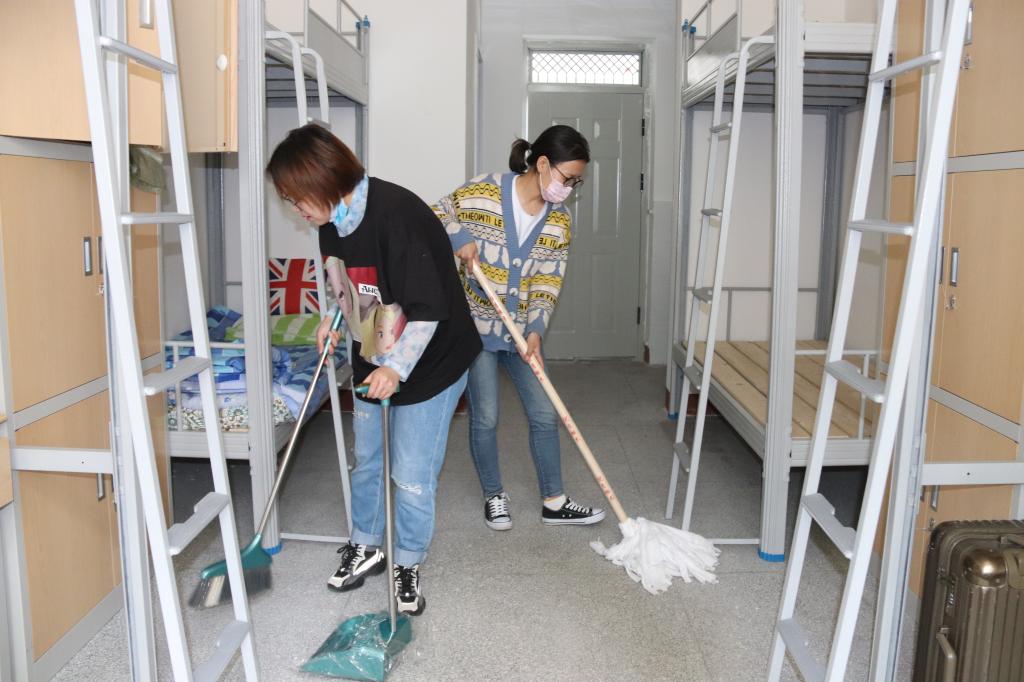 各二级学院辅导员引领学生到公寓门前保持1米间隔排队,再次进行足底消毒、行李消毒、体温测量后进入寝室。
