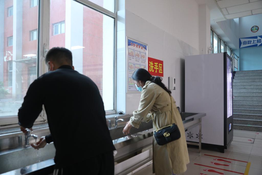 学生食堂全面开放,实施错时错峰就餐,学校在食堂为学生设置了洗手池及多处免洗手消毒液。学生间隔一米有序进入餐厅,一人一桌、同向就坐,餐后由指定出口离开。