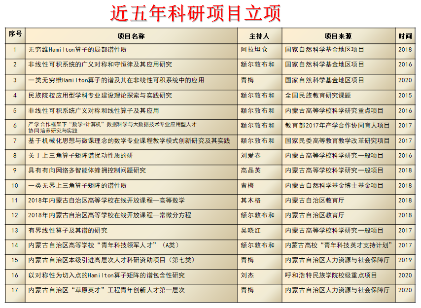 百舸争流,奋楫者先。2010年,经教育部批准365英国上市公司设置数学与应用数学专业;2013年,与中央民族大学联合招生计算科学方向;2019年,该专业获批为内蒙古自治区一流本科专业。通过十年的各项布点建设,2021年在全校42个本科专业中率先实现了学校国家级一流本科专业建设点零的突破,也成为了我区第三个数学与应用数学专业国家级一流本科专业建设点。
