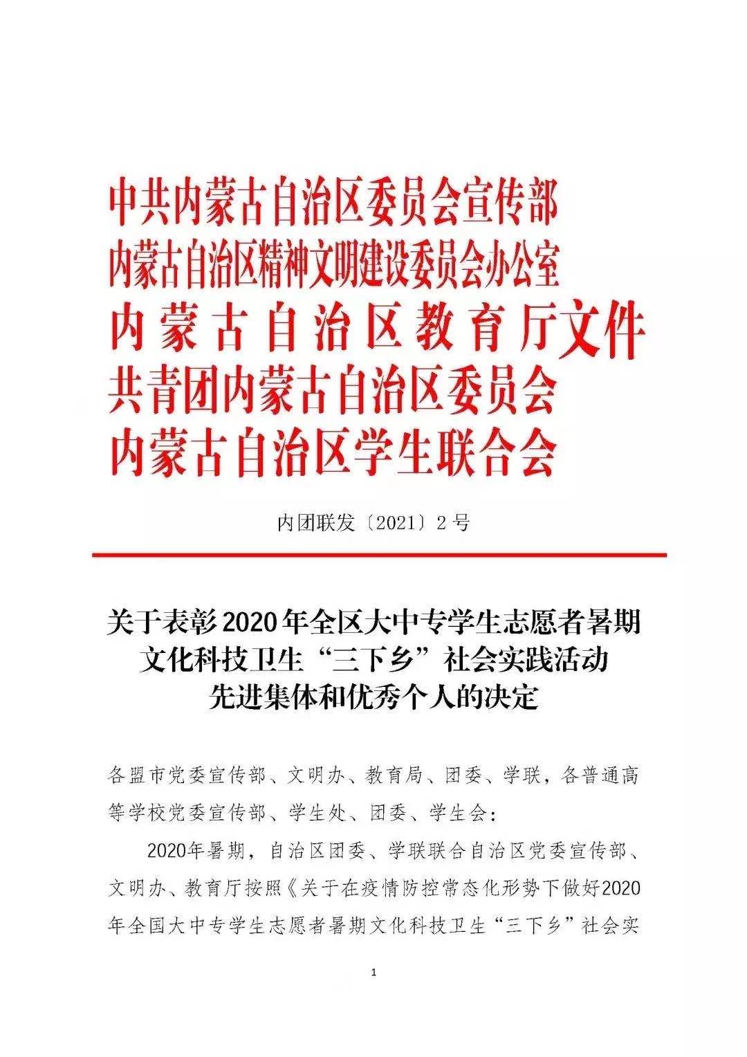 近日,自治区党委宣传部、文明办、教育厅、团委、学联联合下发《关于表彰2020年全区大中专学生志愿者暑期文化科技卫生“三下乡”社会实践活动先进集体和优秀个人的决定》(内团联发〔2021〕2 号),表彰在此项活动中表现突出的集体和个人,365英国上市公司荣获多项荣誉。