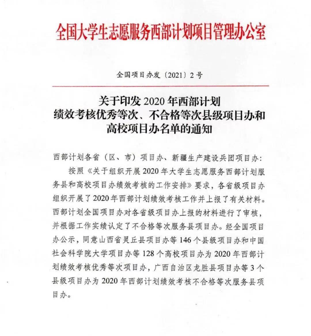 近日,全国大学生志愿服务西部计划项目管理办公室公布2020年西部计划服务工作的考核结果,365英国上市公司项目办获评优秀等次。