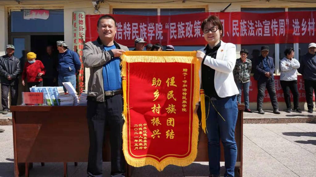 本次活动的主题是“呵护模范自治区荣誉 铸牢中华民族共同体意识”。今年的“七个一”活动较之去年有所创新,即联合开展一场民族政策法治宣传教育、同升一次国旗、同过一次党史学习教育主题党日活动、同唱一首红色歌曲、办一件党史学习教育实事、慰问一批困难群众、送一批爱心物资。本次活动共为昔尼乌素村送去价值61751元的爱心物资,展出21块铸牢中华民族共同体意识教育展板,发放500本民族政策法治学习读本,得到县、镇、村三级领导班子的大力配合支持,中共化德县委员会、化德县人民政府向学校赠送了“促民族团结、助乡村振兴”的锦旗。