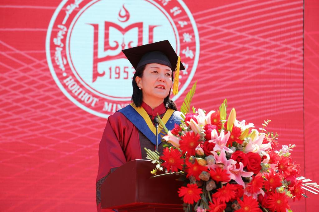 毕业生代表经济管理学院何超越同学饱含深情地回忆了在校学习生活的难忘时光,表达了对母校感谢与祝福。教师代表外国语学院满都呼老师用通俗、轻松又幽默的话语分享了学校的发展变化和优秀校友的故事,并寄语毕业生在未来的道路上行稳致远,在平凡的人生中追求卓越的成绩。