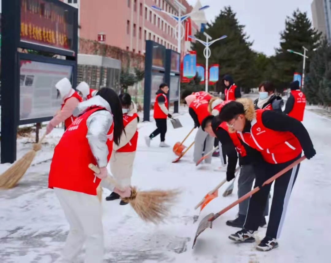 六、清扫道路积雪,携手创建美丽校园。为清扫校园积雪,保证师生出行安全,11月6日下午,学校团委组织大学生志愿者服务队在校园主要干道开展了志愿服务活动。志愿者们手持铁锹和扫把,团结协作积极投入到扫雪活动中,把都林广场和都林楼北侧道路积雪清扫干净,为广大师生出行提供了方便、安全、洁净的校园环境,充分展现了新时代大学生精神风貌,弘扬了雷锋精神。