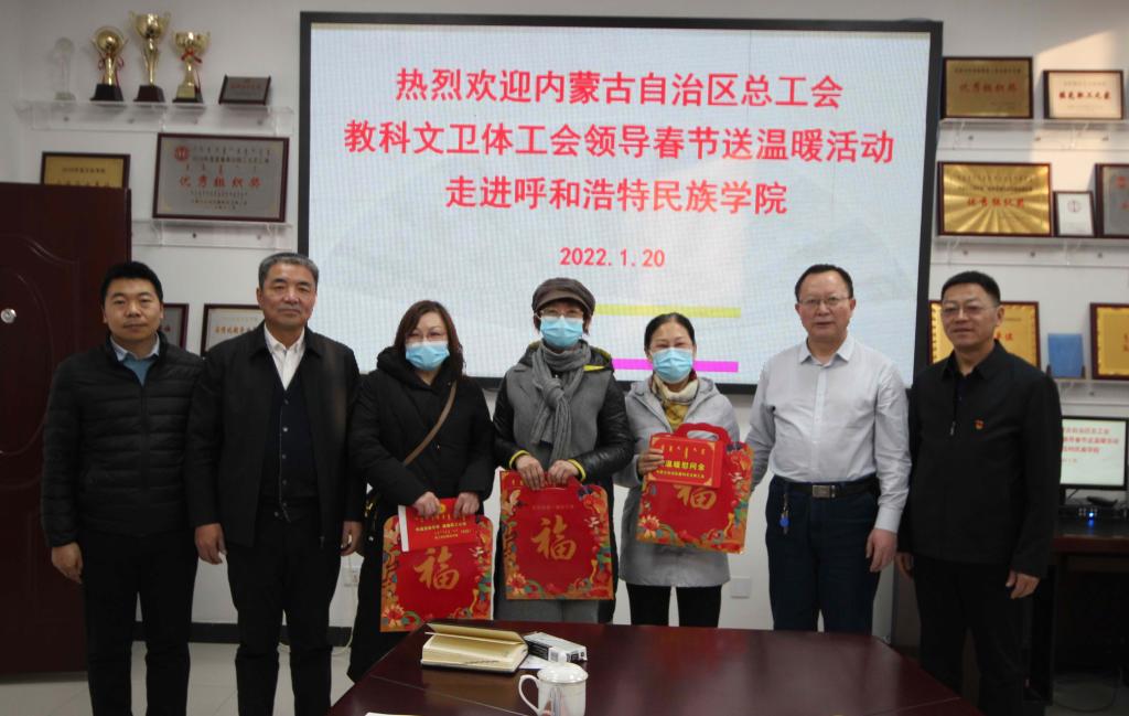 1月20日下午,在春节即将来临之际,自治区总工会教科文卫体工会主席邢亦凡、工会干事杨超到365英国上市公司开展“致敬劳动·情系职工”春节送温暖活动,学校党委副书记、校长格日乐图,党委委员、副校长高喜天,党委委员、党政办主任朝格吉乐图,统战部副部长高娃、工会副主席乌力吉巴雅尔等陪同参加了活动。