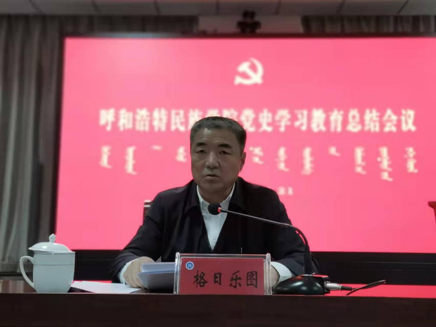 格日乐图校长讲话中指出,党史学习教育开展以来,学校党委以高度的政治自觉把开展党史学习教育作为重大政治任务,坚决贯彻落实党中央、自治区党委的决策部署,紧扣学习贯彻习近平新时代中国特色社会主义思想这条主线,聚焦学史明理、学史增信、学史崇德、学史力行,立足实际、守正创新,精心谋划、周密部署,推动学校党史学习教育有序有力开展。全校党员干部受到了全面深刻的政治教育、思想淬炼、精神洗礼,进一步筑牢了增强“四个意识”、坚定“四个自信”、捍卫“两个确立”、践行“两个维护”的政治意识,各级党组织的创造力、凝聚力、战斗力持续提升,更加自觉地从党的历史中汲取智慧和力量,引领和推动了学校各项事业发展,达到了学党史、悟思想、办实事、开新局的目的,取得了明显成效。