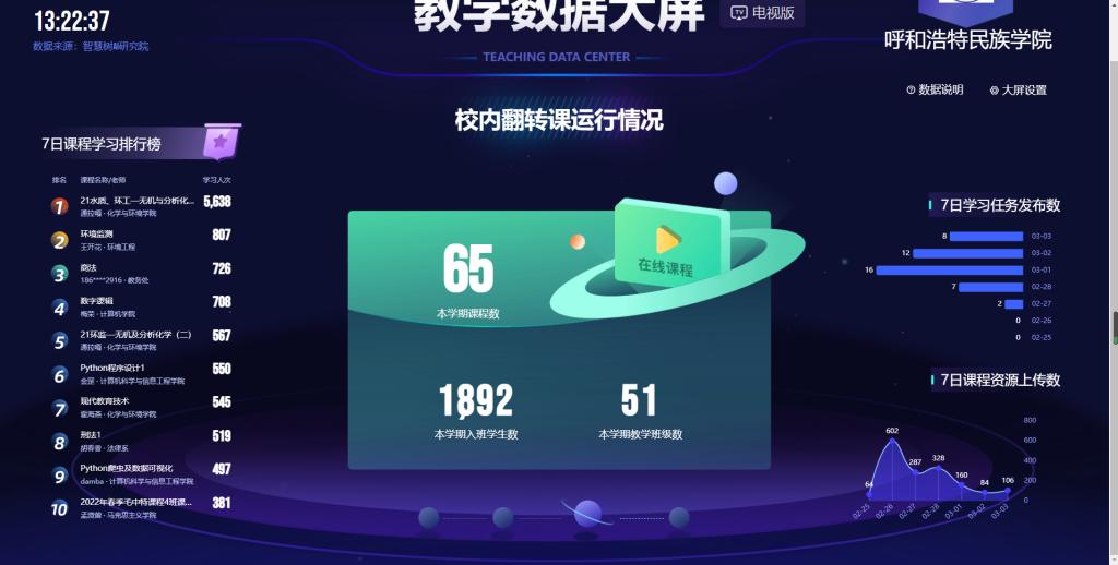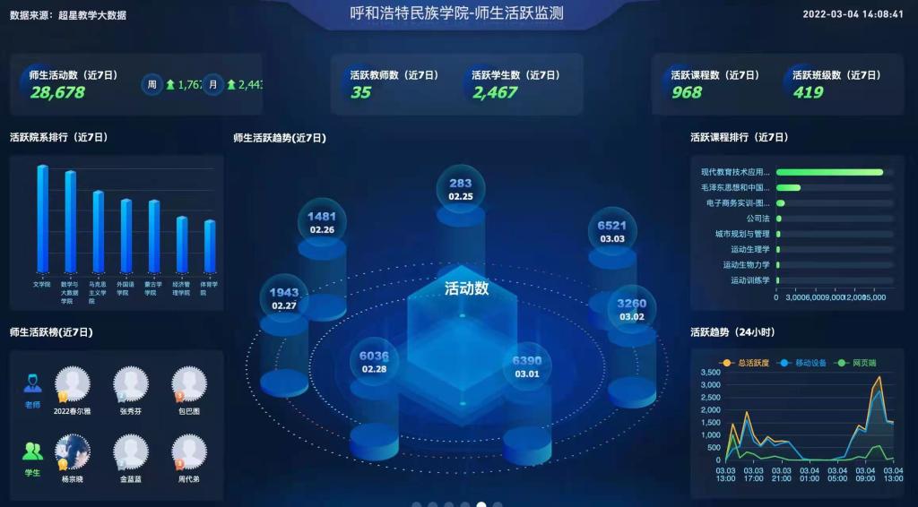 精准运行。在校党委正确领导下,经过全校师生的同心协力,学校2022年春季学期第一周在线教学平稳运行。学校实施线上教学日报制,及时掌握、立即解决线上教学运行情况和存在的问题。第一教学周,全校472名教师开设课程共508门类,开展在线教学2595门次;学生在线学习83509人次,课程参与度达到96.96%,其余学生参与其它实践教学环节(其中撰写毕业论文和学年论文的学生2903人次)。从各平台反馈来看,在智慧树平台上实施翻转课65门,化学与环境工程学院通拉嘎副教授的“无机与分析化学”课学习排行榜第一,学生参与课内外学习共5638人次;在超星尔雅平台上活跃班级419个、活跃课程968门次,师生活动数达到28678人次,教学平台运行效果和学生线上学习效果良好。
