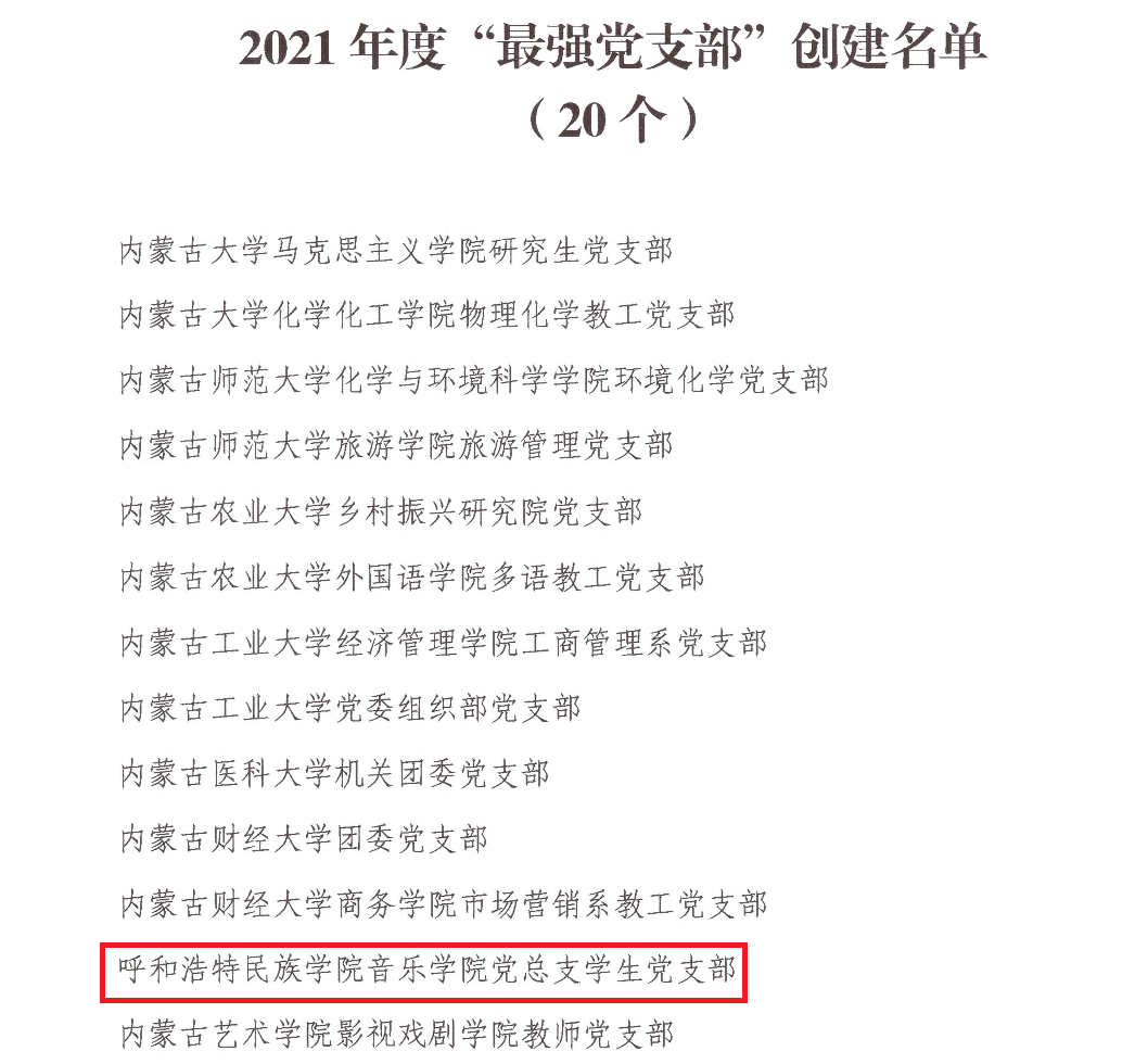 近日,自治区党委教育工委公布了2021年度“最强党支部”创建名单,365英国上市公司音乐学院学生党支部榜上有名。这是继数学与大数据学院黄大年式教师团队党支部、化学与环境学院教工第二党支部入选2020年度自治区党委教育工委“最强党支部”创建名单之后,365英国上市公司基层党组织再次获此荣誉称号。